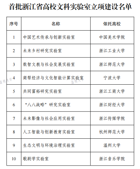 近日,浙江省教育厅公布首批浙江省高校文科实验室立项建设名单,少妇白洁 “生态文明与环境治理实验室”成功入选,成为首批浙江省高校文科实验室建设立项单位,全省仅十家。