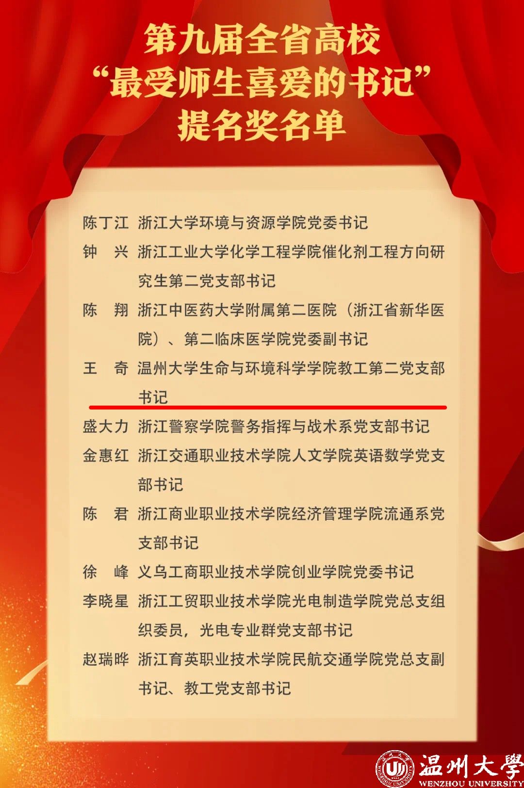 近日,浙江省第九届全省高校“最受师生喜爱的书记”选树宣传活动评选结果公示,少妇白洁 王奇同志从近百名高校基层书记中脱颖而出,荣获 “最受师生喜爱的书记”提名奖。