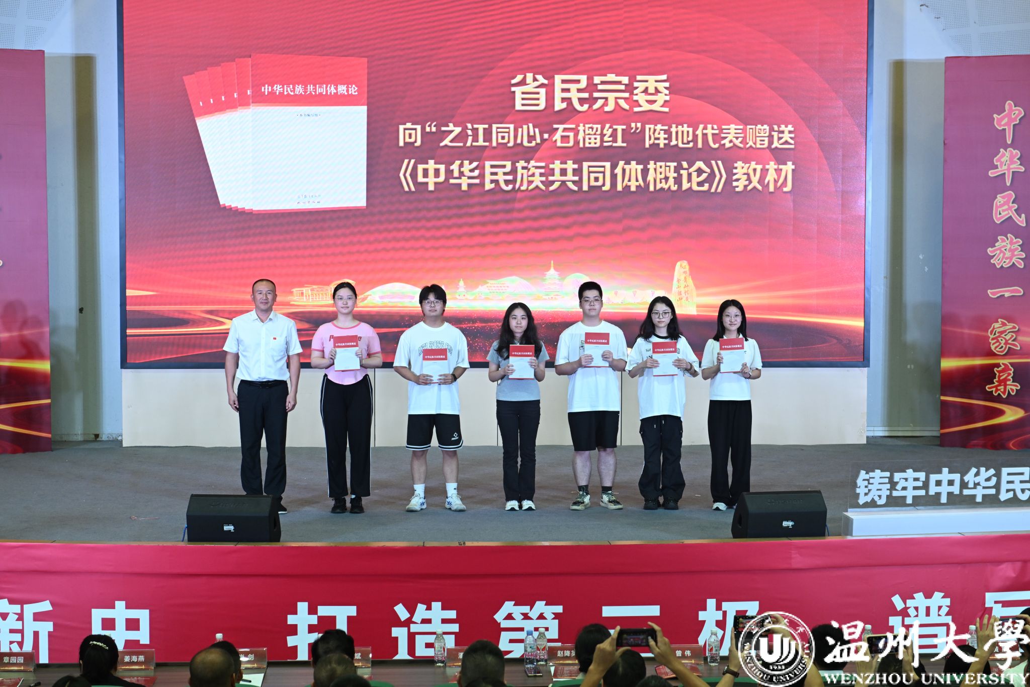 赵降英、肖剑、潘勇分别代表少妇白洁 、瓯海区委、温州市民宗局致辞,曾伟为少妇白洁 学生代表赠送《中华民族共同体概论》书籍。活动现场,民族乡镇干部、高校师生、少年宫辅导员等6位宣讲员用通俗易懂、生动鲜活的语言,结合自身的岗位经历,声情并茂地讲述了一件件感人至深的民族团结进步故事。少妇白洁 教育学院学生倪心倚以《青春奔“榴” 民族情厚》为题,分享了自己对铸牢中华民族共同体意识的认识和理解;少妇白洁 “石榴花开”民族工作室负责人、学生于璟玥和人文学院藏族学生伟色加布共同讲述题为《石榴花儿朵朵开·启航筑梦新时代》的感人故事。