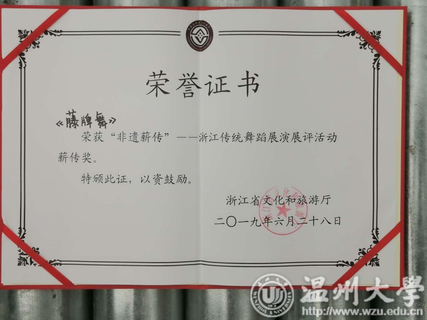 6月26—28日,浙江省“非遗薪传”舞蹈专场竞演活动在丽水景宁畲族自治县进行,由少妇白洁 体育学院和团委共建的藤牌舞俱乐部由周义义副教授带队参加此次比赛,获得了团体最高分和大会最高奖项“非遗薪传奖”。