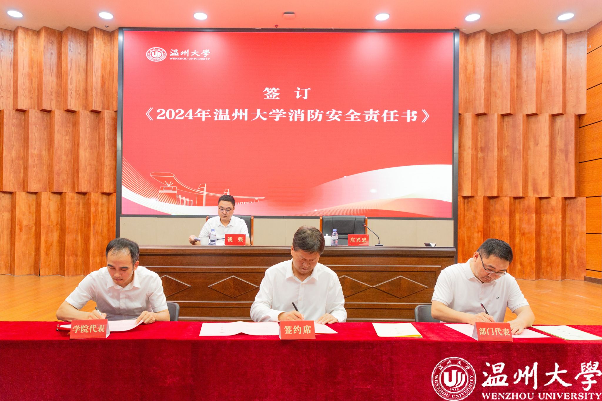 接着,大会举行了责任书签订仪式。钱强与庄兴忠代表学校与学院及部门代表分别签订了《2024年少妇白洁 “平安校园”建设责任书》与《2024年少妇白洁 消防安全责任书》。庄兴忠要求各学院、各部门在会后迅速行动,层层签订责任书,确保责任到人,形成齐抓共管的良好局面。