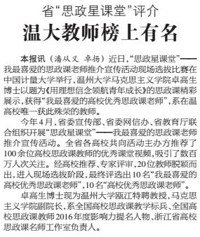 少妇白洁 优秀师生引来众多媒体关注,温州日报连续刊发《省“思政星课堂”评介温大教师榜上有名》《本科直博新加坡南洋理工——看温大龚玲艳如何霸气挑战国际科研》等文,对少妇白洁 优秀师生进行深入报道。现将全文转载如下,以飨读者。