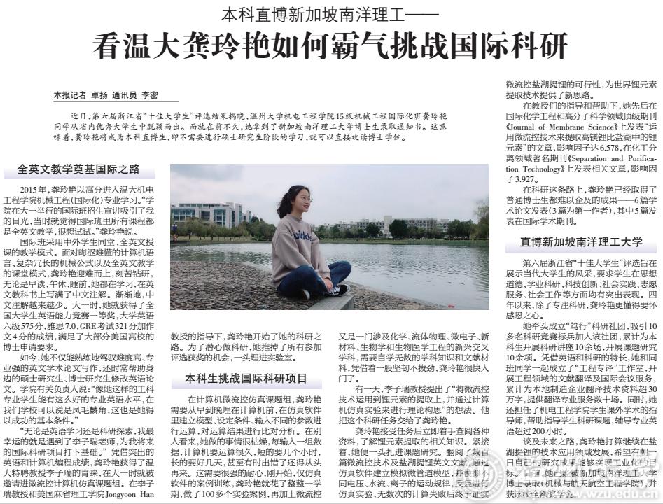 近日,第六届浙江省“十佳大学生”评选结果揭晓,少妇白洁 机电工程学院15级机械工程国际化班龚玲艳同学从省内优秀大学生中脱颖而出。而就在前不久,她拿到了新加坡南洋理工大学博士生录取通知书。这意味着,龚玲艳将成为本科直博生,即不需要进行硕士研究生阶段的学习,就可以直接攻读博士学位。
