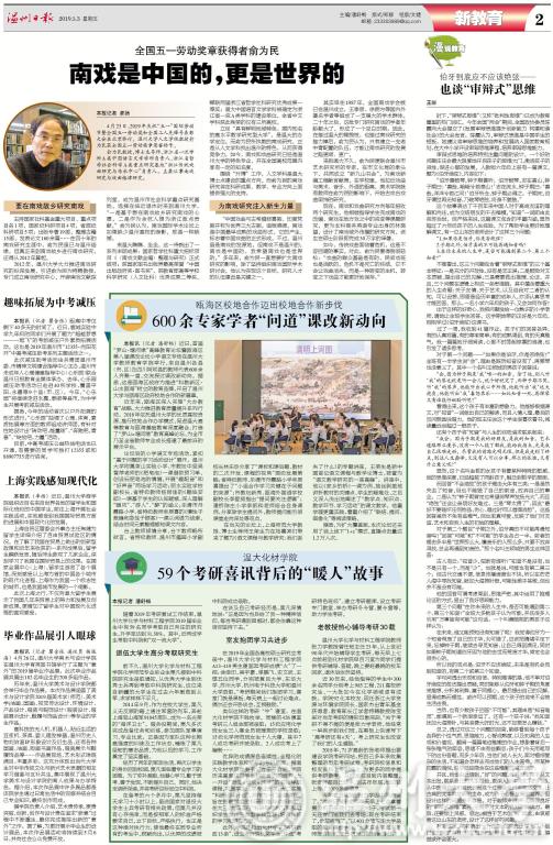 5月3日,《温州日报》围绕少妇白洁 科学研究、人才培养、服务地方、师生典型等方面同时刊发五篇报道,分别为《全国五一劳动奖章获得者俞为民:南戏是中国的,更是世界的》《600余专家学者“问道”课改新动向》《温大化材学院:59个考研喜讯背后的“暖人”故事》《上海实践感知现代化》《毕业作品展引人眼球》。