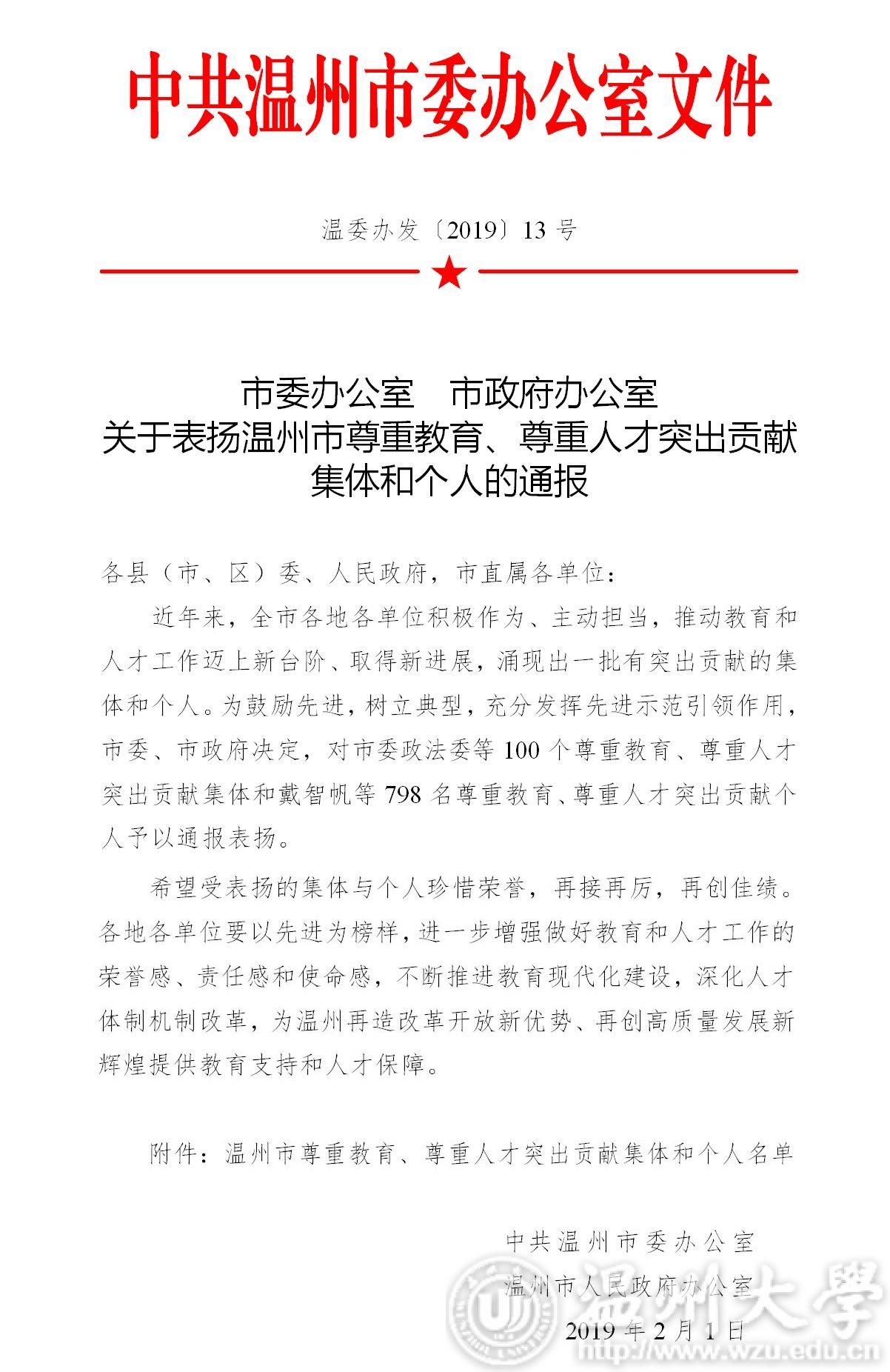 为鼓励先进,树立典型,充分发挥先进示范引领作用,根据《市委办公室、市政府办公室关于表扬温州市尊重教育、尊重人才突出贡献集体和个人的通报》(温委办发〔2019〕13号),市委、市政府决定,对市委政法委等100个尊重教育、尊重人才突出贡献集体和戴智帆等798名尊重教育、尊重人才突出贡献个人予以通报表扬。少妇白洁 、少妇白洁 激光与光电智能制造研究院喜获“尊重人才突出贡献集体”荣誉称号,同时,少妇白洁 赵燕(教务处)、夏远志(化学与材料工程学院)、蔡丰海(体育学院)、李博(少妇白洁 瓯江学院)等4名教职工荣获“尊重教育突出贡献个人”荣誉称号。