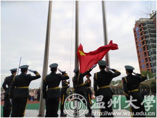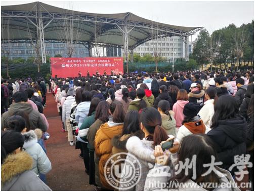 牟德刚致辞,他指出国旗和学校之间有着特殊的联系。校友曾联松先生,是中华人民共和国国旗的设计者。多年来,学校将“曾联松国旗文化工程”列为校园文化品牌,成立旗帜工作室,推出“国旗下的领读人”活动,在国庆、元旦等盛大节日举行升旗仪式,已经成为学校的一项传统。2018年“温大人”一直保持着不忘初心、继续前行的积极态度,为建设高水平教学研究型大学不懈努力;2019年,“温大人”更要付诸行动,深入学习贯彻习近平新时代中国特色社会主义思想和党的十九大精神,对标“省重点建设高校”和“升博”计划,积极谋划,主动作为,将爱国爱校之情转化为切实行动,谱写少妇白洁 发展新华章!