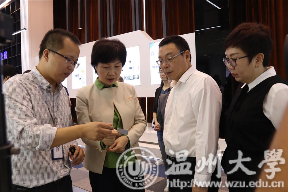 郑朝阳一行参观了研究院展厅,听取了关于展厅建设主旨、人才团队、科研成果等介绍。在科技成果展示版块,郑朝阳饶有兴趣地拿起了激光无油墨打印技术的样品观看,仔细询问了激光印刷与传统印刷相比的优势和特点。