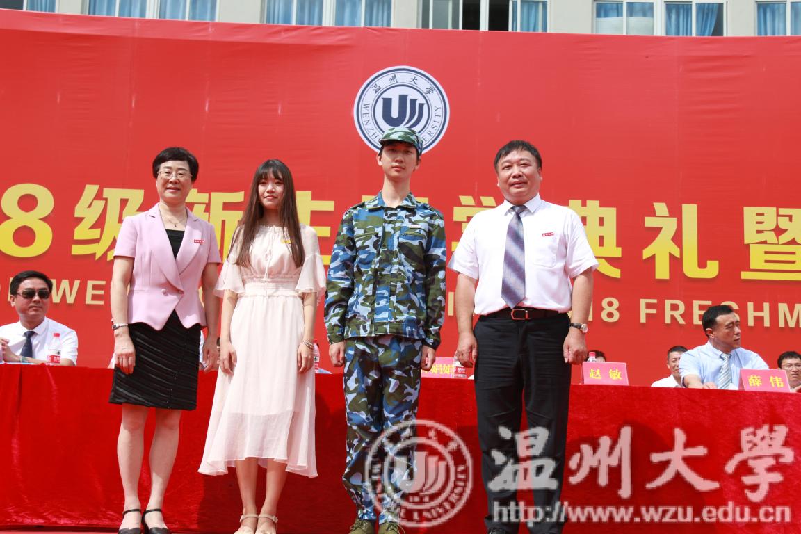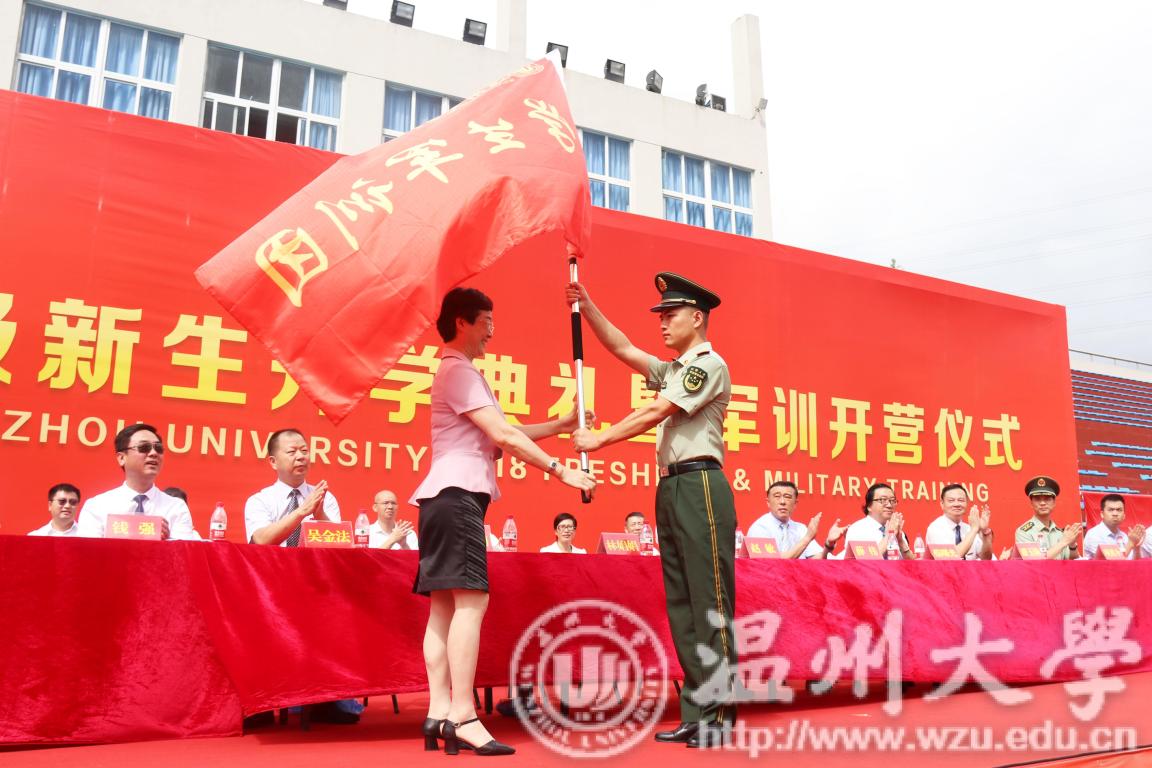 校徽凝结着厚重的温大底蕴,传承着不朽的温大精神。校党委书记林娟娟和校长赵敏分别为两位新生代表佩戴校徽。随后,林娟娟书记为2018级新生军训团授旗。