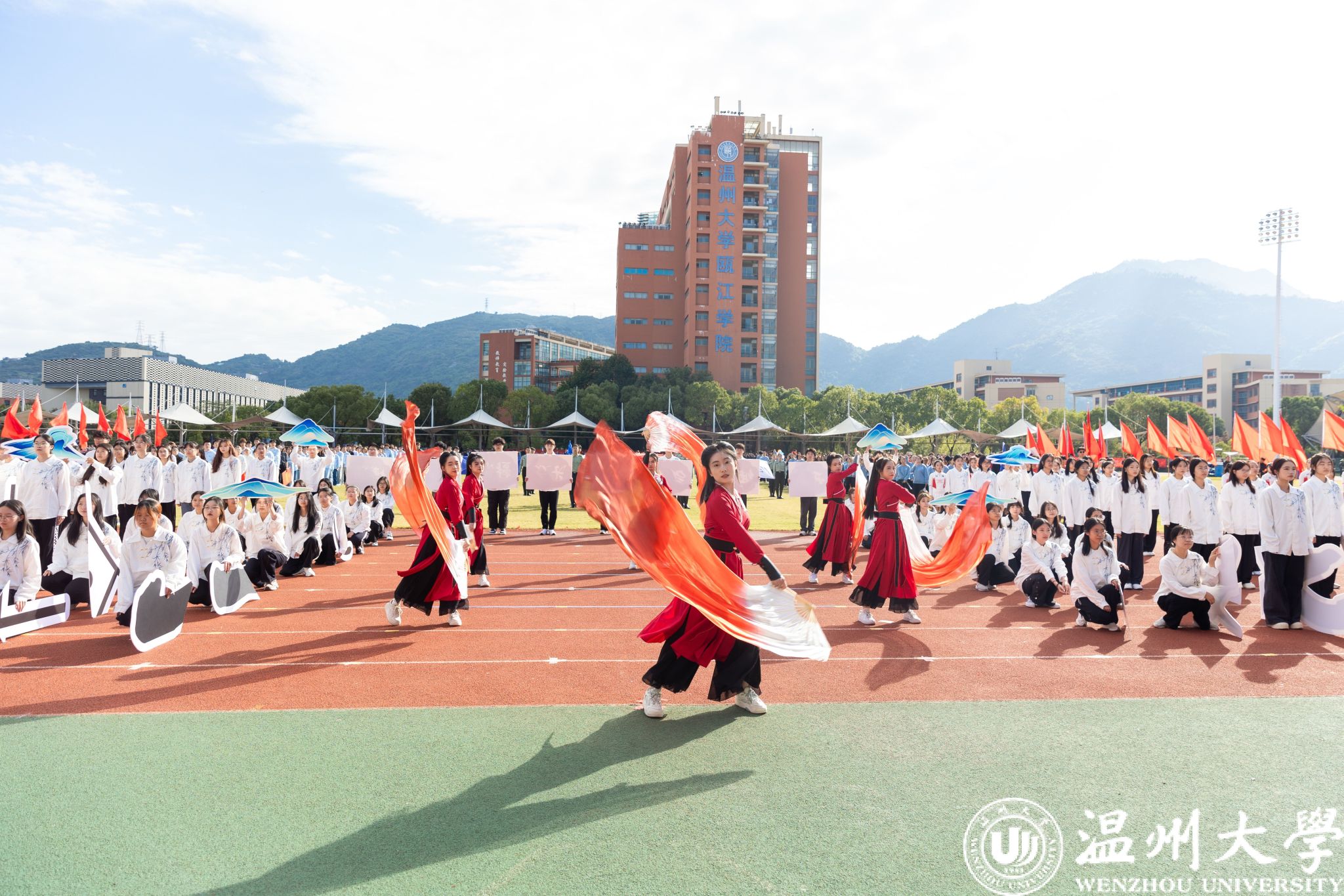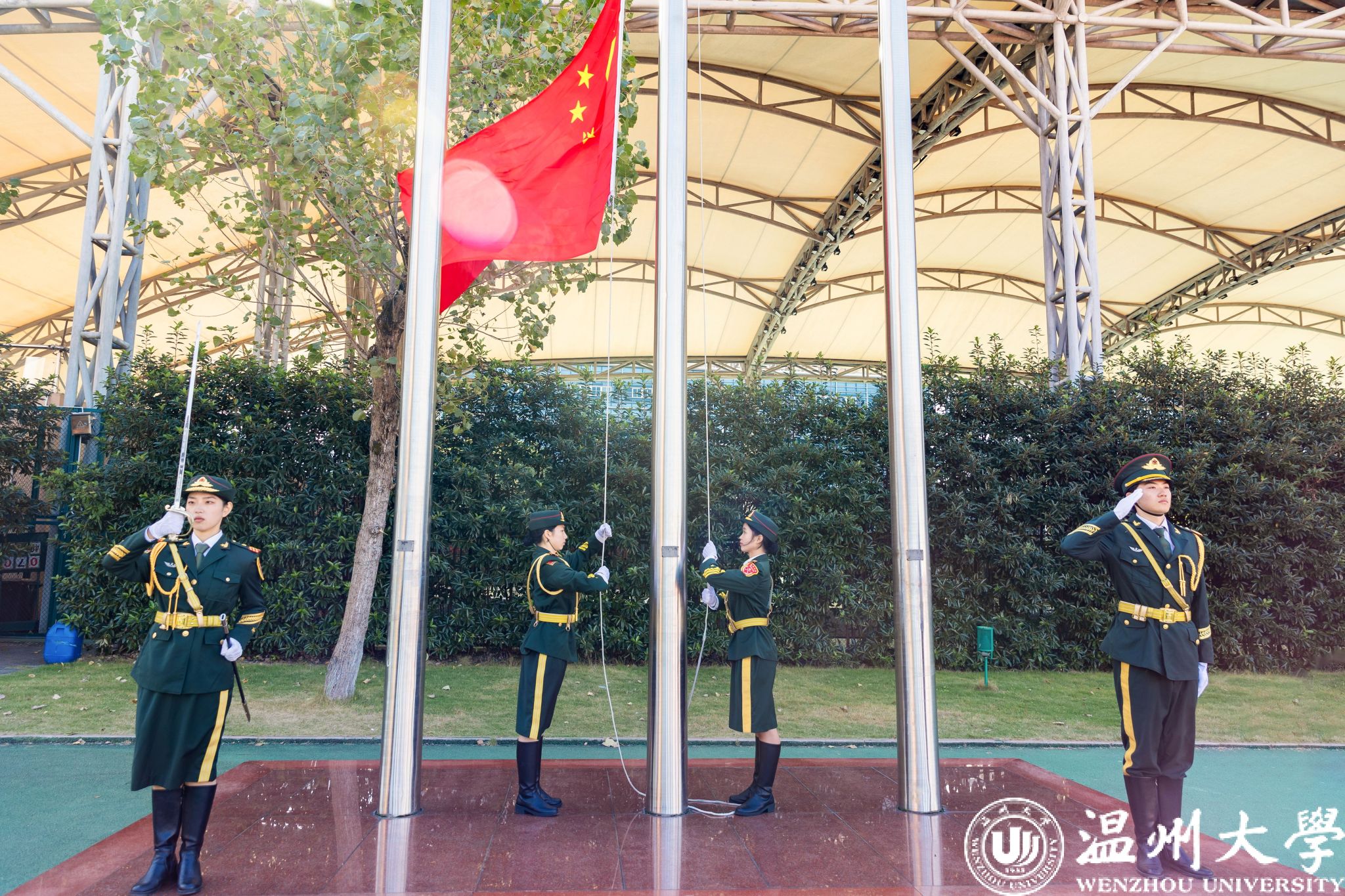 温大师生齐唱国歌,五星红旗冉冉升起。旗帜飘扬,激励着每一个人为着更高的荣誉、更远的目标而努力奋斗。