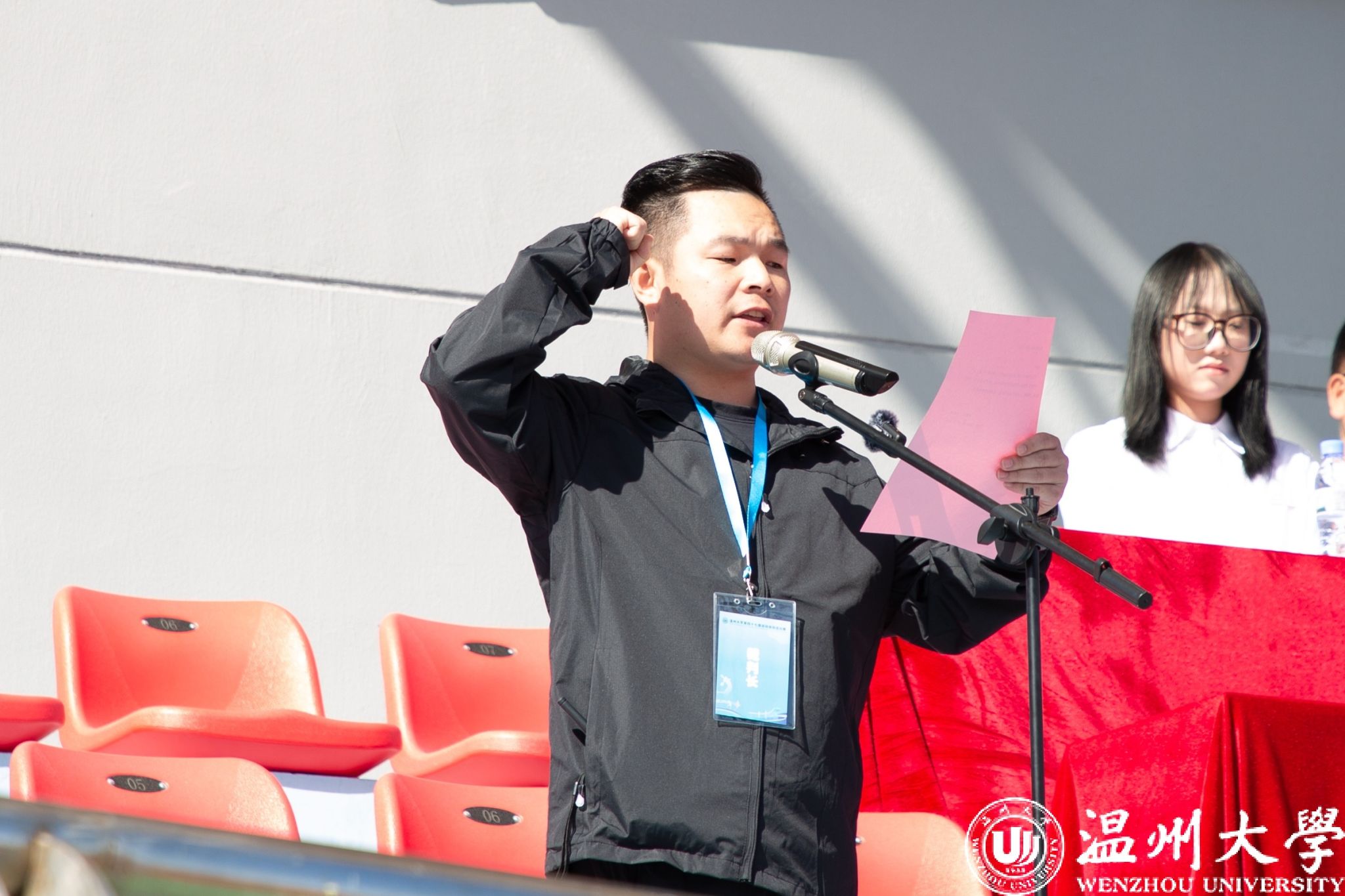 田径200米一级运动员李焯晨与田径运动会现场展示裁判长、体操专业教师丁亚帅宣誓,承诺将赛出水平、赛出风格,秉持公正、公平、公开的原则,护航温大体育精神。
