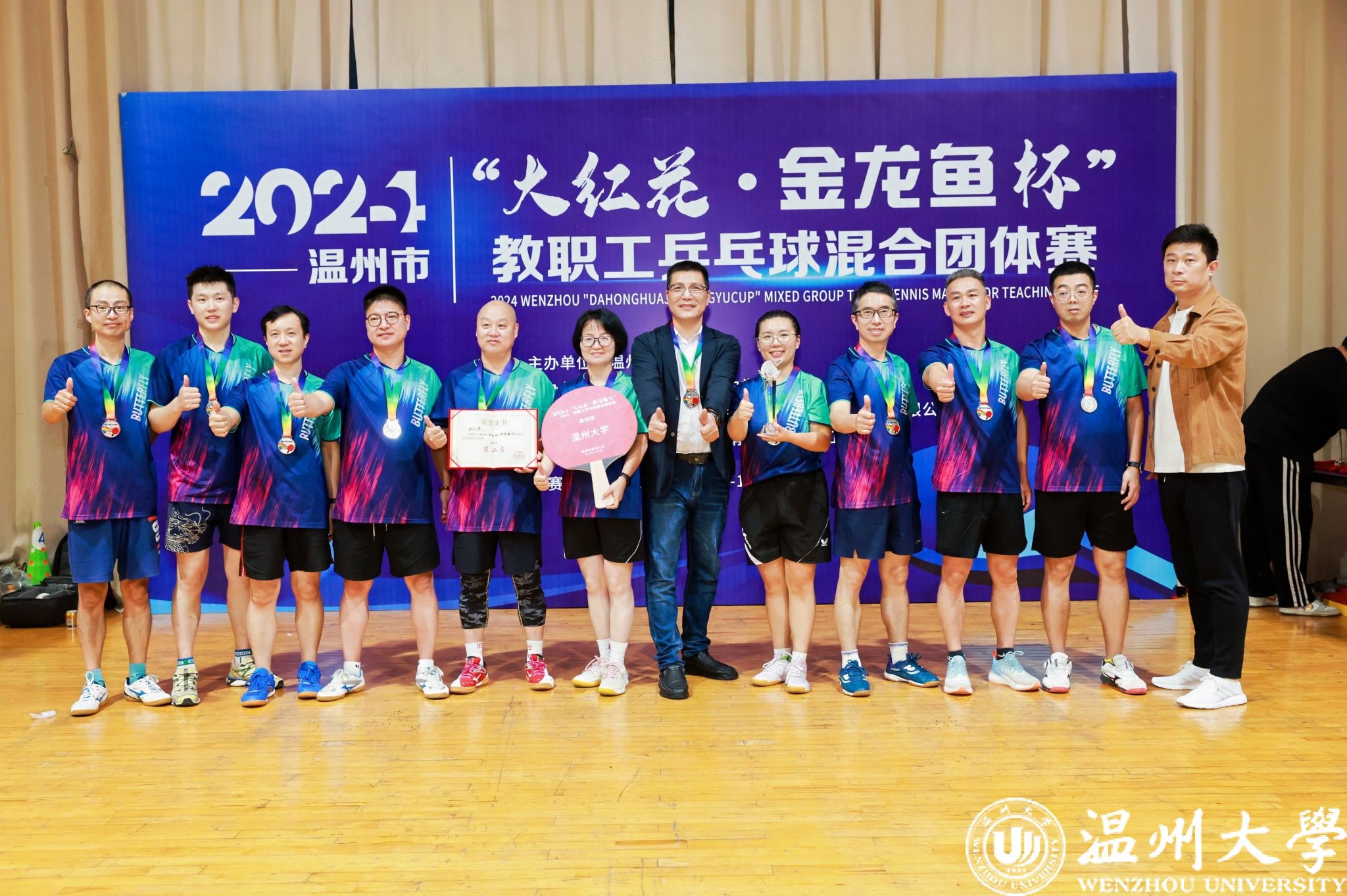11月9日-10日,温州市教育工会主办的2024年温州市“大红花杯”教职工乒乓球混合团体赛在温州市第二实验中学举办。少妇白洁 教职工代表队参加了高校组的比赛,并取得了高校组亚军的好成绩。