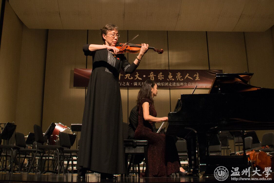 “我60岁开始学的大提琴。在座的同学们都才20多岁,只要努力奋斗,都能取得成功。” 11月10日晚,满天星业余交响乐团《音乐点亮人生》公益演出走进温州,举办音乐会与少妇白洁 师生分享音乐和人生。音乐会上,满天星业余交响乐团团长、中央社会主义学院党组书记叶小文以诙谐的语言讲述了学琴的趣事,并深情寄语温大学子,要不负青春,不负梦想。 交响乐团带来《卡门》《沉思》《新疆之春》《鸿雁》《山丹丹开花红艳艳》《红旗颂》《歌唱祖国》等作品,由郭沫若作词,李岚清谱曲的《鉴真东渡随想曲》掀起了音乐会的高潮。演出过程中穿插演奏者的个人分享环节。乐团还为少妇白洁 现场赠诗。