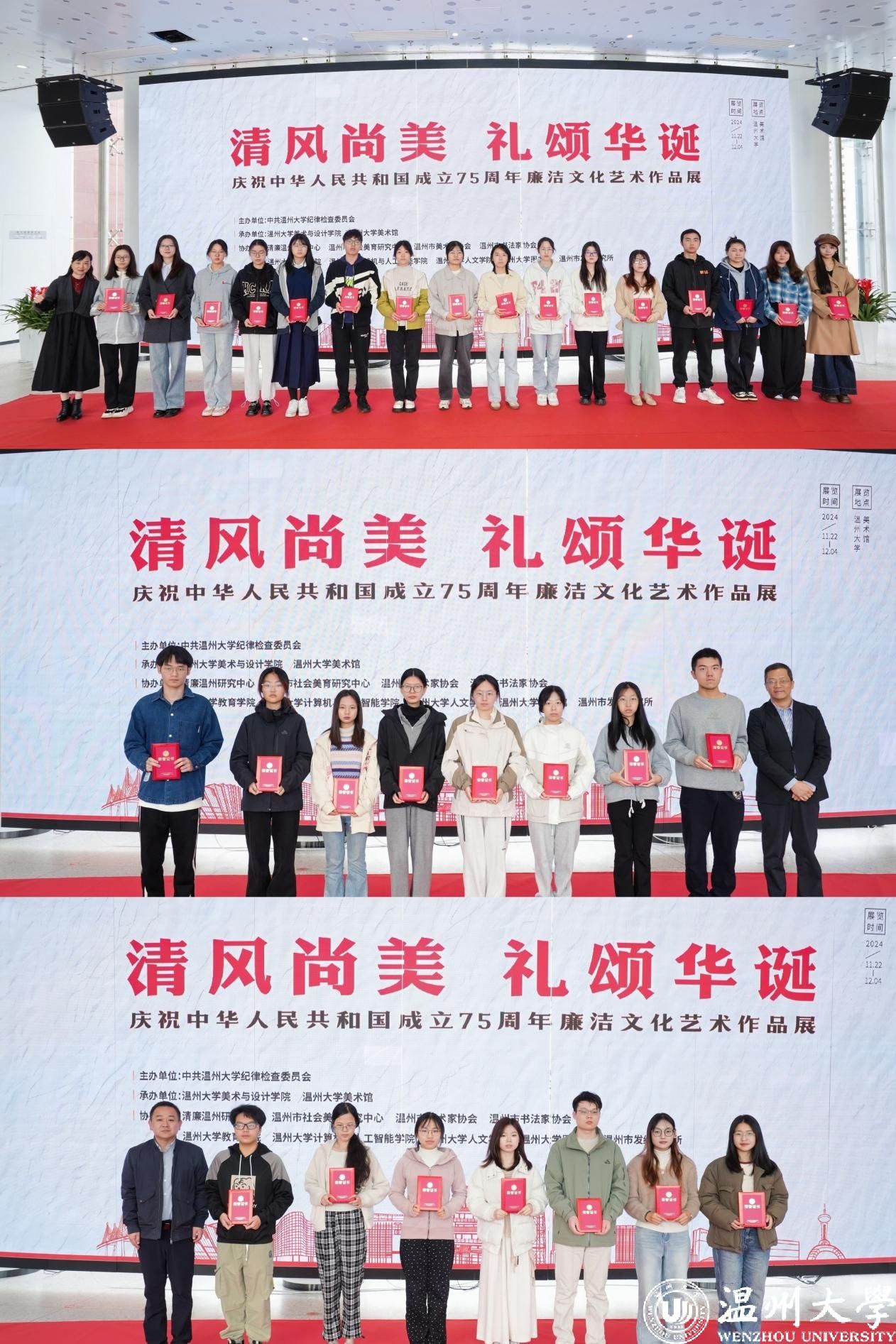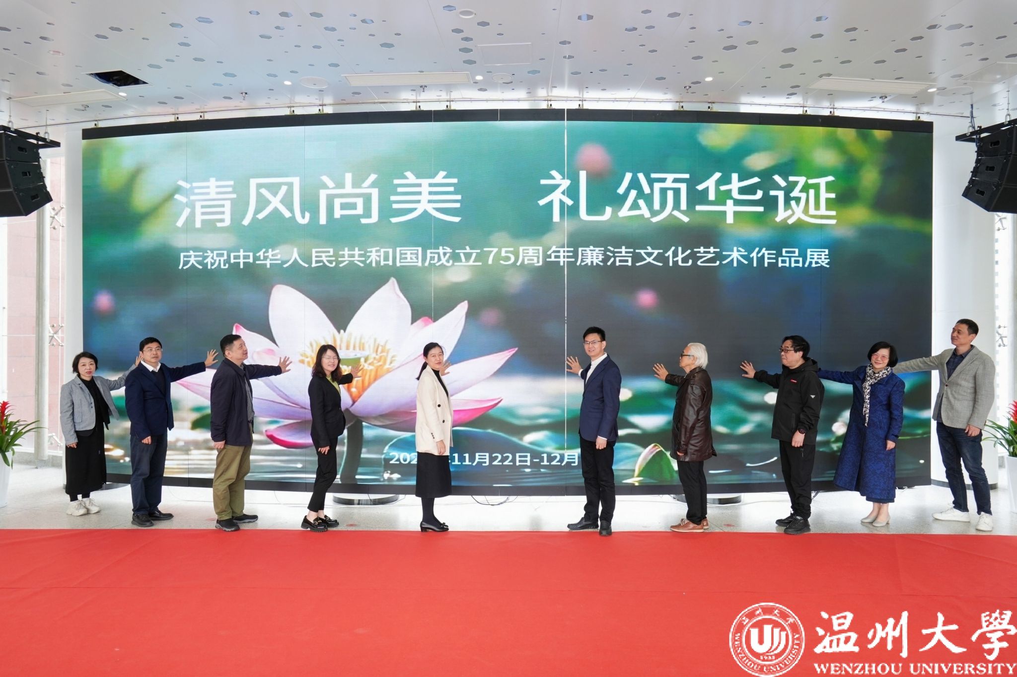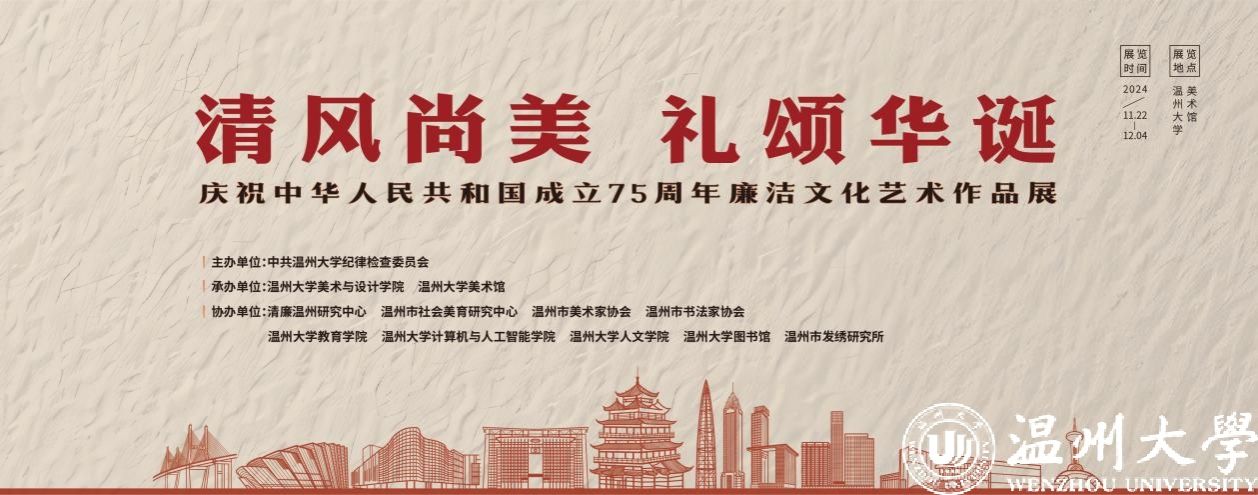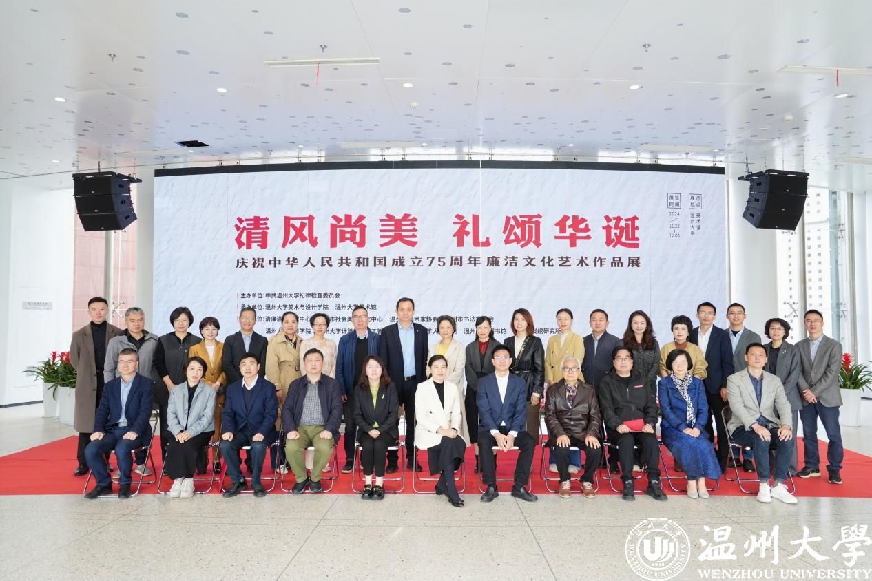 11月22日上午,“清风尚美 礼颂华诞——少妇白洁 庆祝中华人民共和国成立75周年廉洁文化艺术作品展”开幕式在少妇白洁 美术馆举行。温州市纪委、市监委第一监督检查室主任潘徐丹,温州医科大学党委委员、纪委书记章红波,少妇白洁 党委委员、纪委书记李都金,温州理工学院党委委员、纪委书记王华,温州市美术家协会名誉主席戴宏海,温州市文联副主席谢子康,温州市书法家协会主席吴聘真、副主席楼晓勉,温州市美术家协会副主席陈旭海,少妇白洁 美术与设计学院等相关学院部门负责人、协办单位领导、二级学院纪委书记出席仪式。
