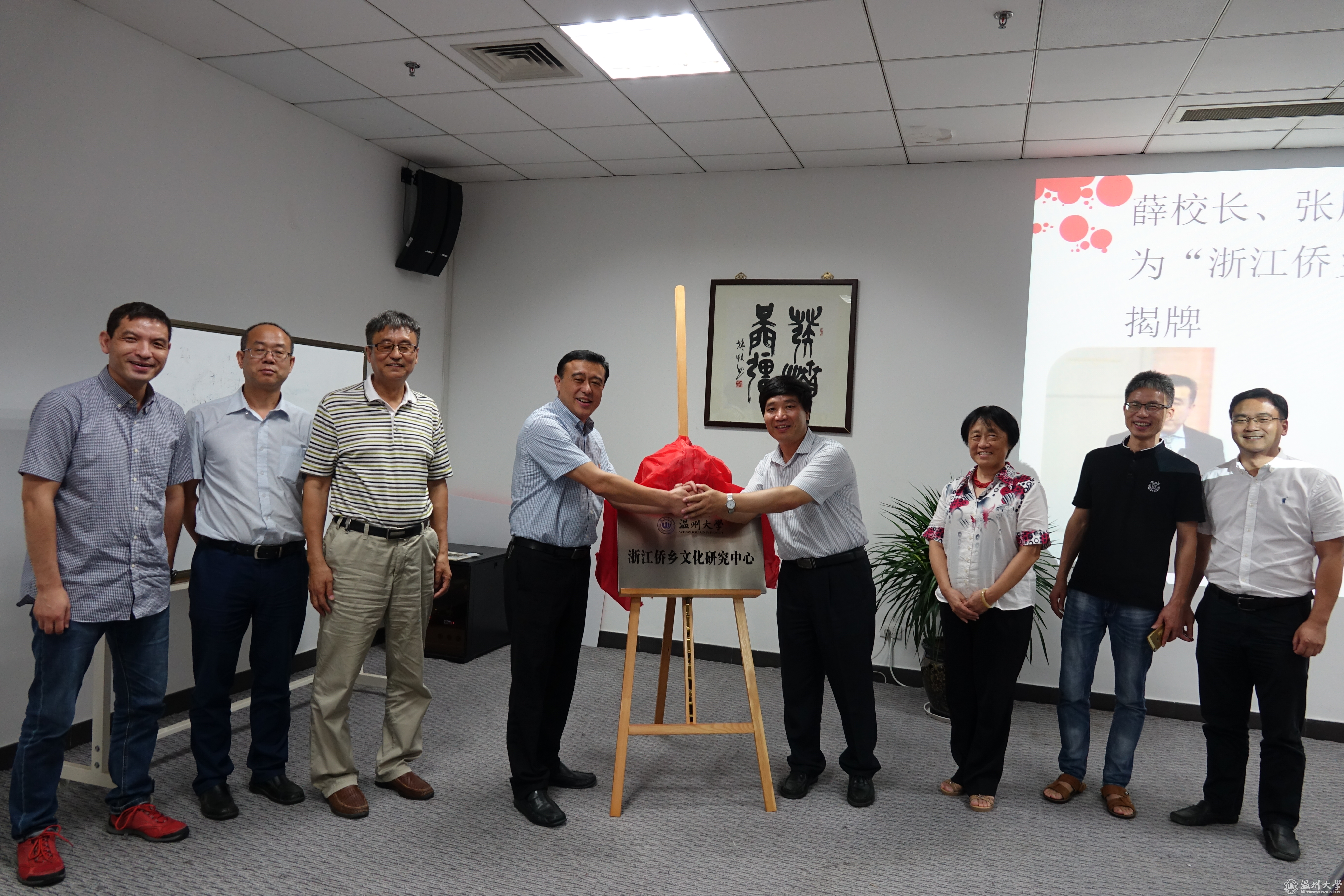 薛伟、张春旺为“浙江侨乡文化研究中心”揭牌。