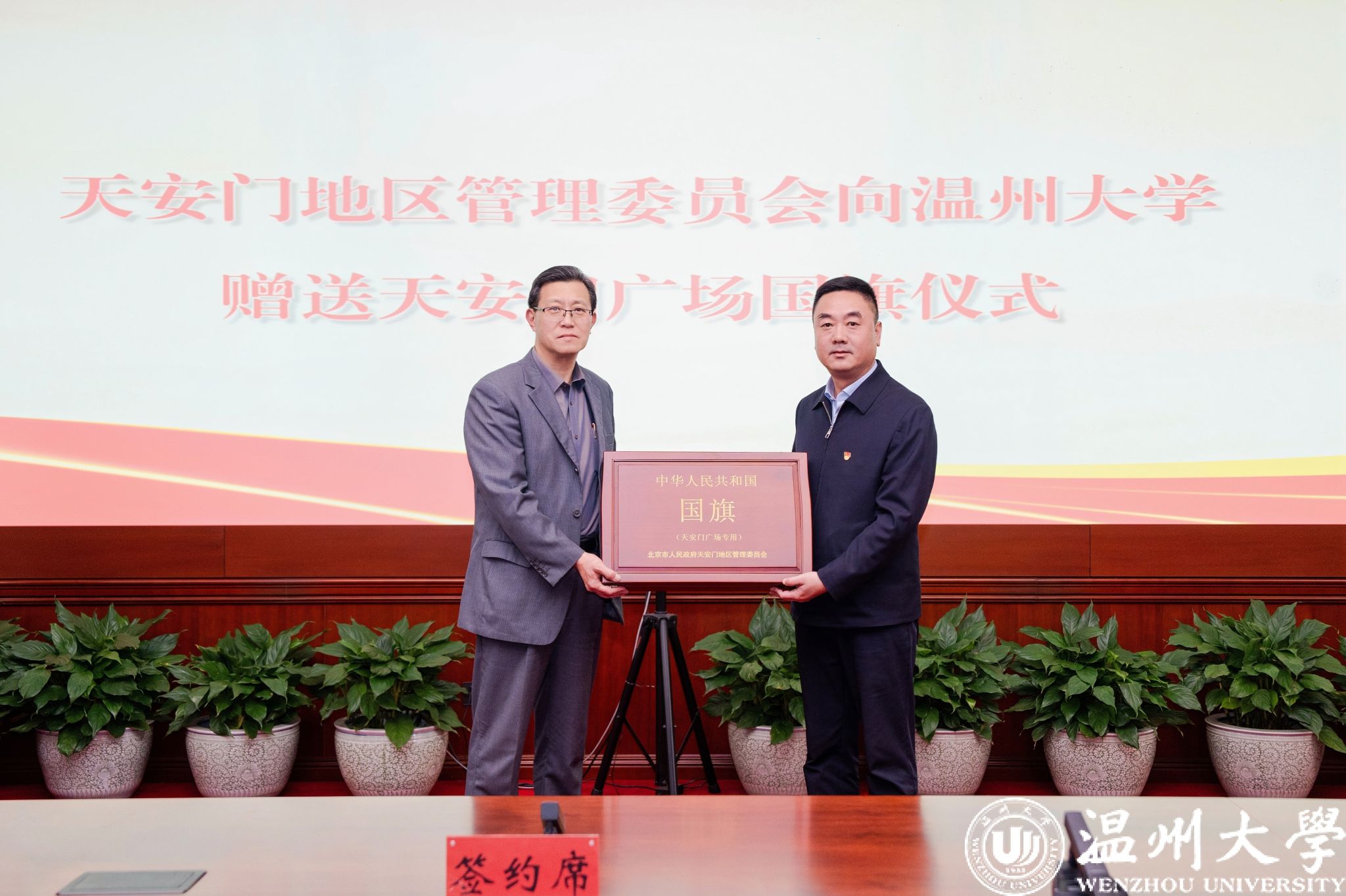 赠送仪式上,天安门地区管委会党组成员、副主任姚辉与钱强书记代表双方单位签订赠送协议,姚辉副主任向少妇白洁 赠送天安门广场国旗。
