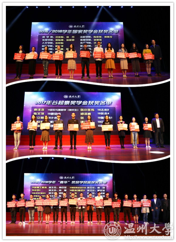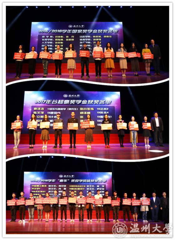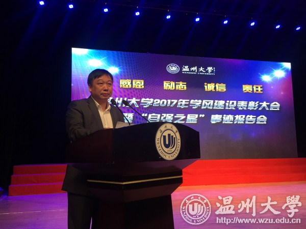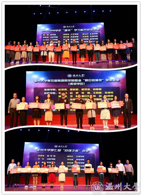赵敏致辞。他肯定了过去一年温大学子在学习上取得的成绩,赞赏学生肯学、爱学、乐学,不断挑战自我、大胆创新突破,既实现了个人的成长和超越,更浓郁了以学习为荣、为乐、为时尚的校园氛围,充分展现了锐意进取、朝气昂扬的精神风貌。他指出,关爱每一位学生,努力促进每一位学生全面、健康、快乐成长,为学生的成长与发展提供全方位的服务与指导,是学校始终坚持的育人理念。学校将继续积极争取校外资源,扩大资助力度和范围,实行“罗山展翅”技能帮扶计划,完善以“奖助学金、助学贷款、学费减免、困难补助、勤工助学”为主体,经济帮扶、能力帮扶、精神帮扶一体化的学生资助体系,为困难的同学插上实现梦想的“翅膀”。赵敏希望,温大学子在校学习、生活期间能做到“四个结合”:即将锤炼品格和遵守纪律相结合、学习知识和关注社会相结合、创新思维和锻炼能力相结合,奉献祖国和关爱他人相结合,做“有理想、有追求,有担当、有作为,有品质、有修养”的大学生。