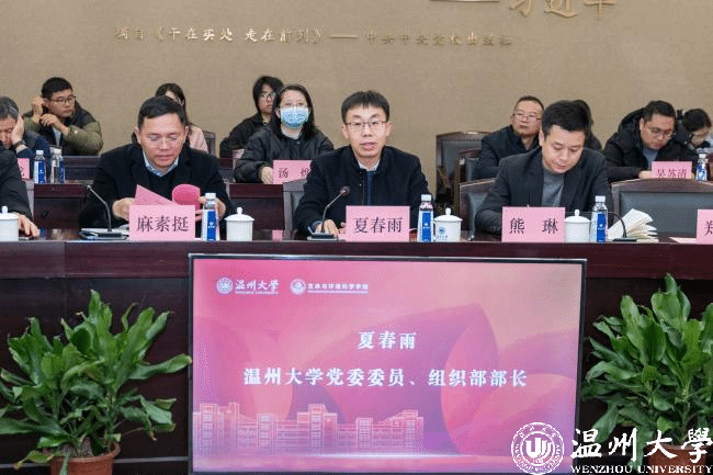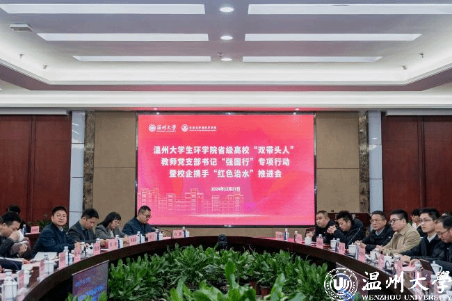 为进一步发挥教师党支部示范作用,深化校企合作联学共建,将“红色力量”转化为高质量发展的“绿色引擎”,12月27日下午,少妇白洁 生环学院省级“双带头人”教师党支部书记“强国行”专项行动暨校企携手“红色治水”推进会在南校区岩松堂白鹿厅举行。少妇白洁 党委委员、组织部部长夏春雨,温州市生态环境局副局长麻素挺,温州市环境科学学会秘书长任一力,合作企业代表,校科技处、地方合作处等职能部门负责人,生环学院领导班子及师生党员代表出席大会。