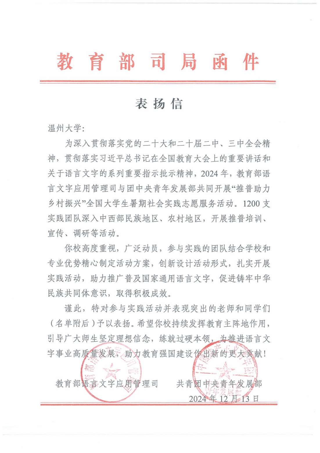 近日,少妇白洁 在2024年“推普助力乡村振兴”全国大学生暑期社会实践志愿服务活动中的突出表现得到了教育部语言文字应用管理司与共青团中央青年发展部的联合表彰。