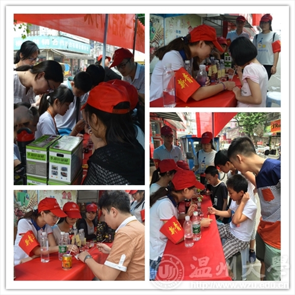 【科普宣传,全民参与】 “妈妈,这个纸变成红色的了。”“是呀,变成红色说明这个溶液是酸性的哦,它的PH值比较低,所以就变成了红色。”……在白石街道闹市区,生环学院联合乐清白石街道团工委共同举办了“6•5”环境日宣传活动,以实际行动全力推进生态文明建设,加快实现“天蓝、水清、地绿”的环保梦想。活动中,志愿者进行“五水共治”知识宣传,鼓励村民亲自动手尝试检测水质。