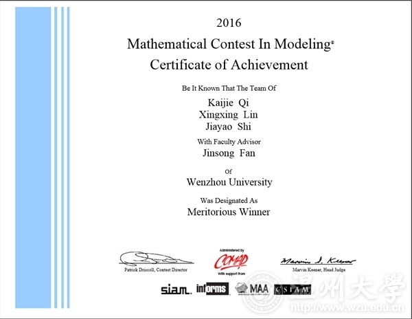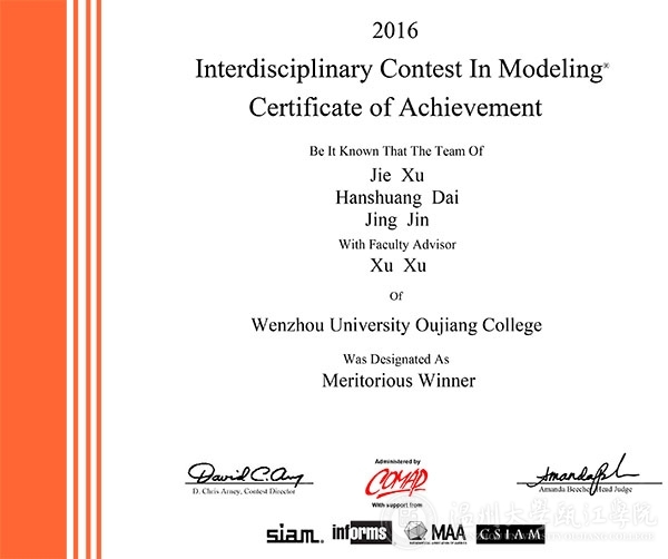 日前,2016年美国大学生数学建模竞赛(MCM/ICM)成绩公布,少妇白洁 瓯江学院、数学与信息科学学院的学子与来自哈佛大学等世界一流大学的学生同台竞技,最终获得一等奖3项,二等奖3项的佳绩,其中,瓯江学院的成绩位列浙江省22所参赛独立学院之首。 2016年美国大学生数学建模竞赛(MCM/ICM)于北京时间2016年1月29日(农历月腊月二十)9点至2月2日9点在全球通过网络同步举行,来自中国、德国、美国、英国、加拿大、新加坡等国家超过10000支大学生队伍参加了竞赛,其中包括来自哈佛大学、普林斯顿大学、麻省理工学院、清华大学、北京大学等国际知名高校学生参与此项赛事角逐。竞赛以三名本科生为一组,在四天时间内,就指定的问题完成从建立数学模型、求解、验证到论文撰写,以清楚的格式、流畅的英文提交一篇20页左右的论文到竞赛组委会。 据悉,美国大学生数学建模竞赛是唯一的国际性数学建模竞赛,也是世界范围内最具影响力的数学建模竞赛,为现今各类数学建模竞赛之鼻祖。该项竞赛始于1985年,由美国数学及其应用联合会(comap)主办,美国数学学会、运筹学学会、工业与应用数学学会等多家机构协办。目前该项赛事已经成为最著名的国际大学生竞赛之一,每年包括哈佛大学、麻省理工学院、北京大学、清华大学等国内外顶级高校的学生都会参加各奖项的角逐。赛题内容涉及经济、管理、环境、资源、生态、医学、安全、未来科技等众多领域,着重强调研究问题、解决方案的原创性、团队合作、交流以及结果的合理性,具有极强的实际应用背景。