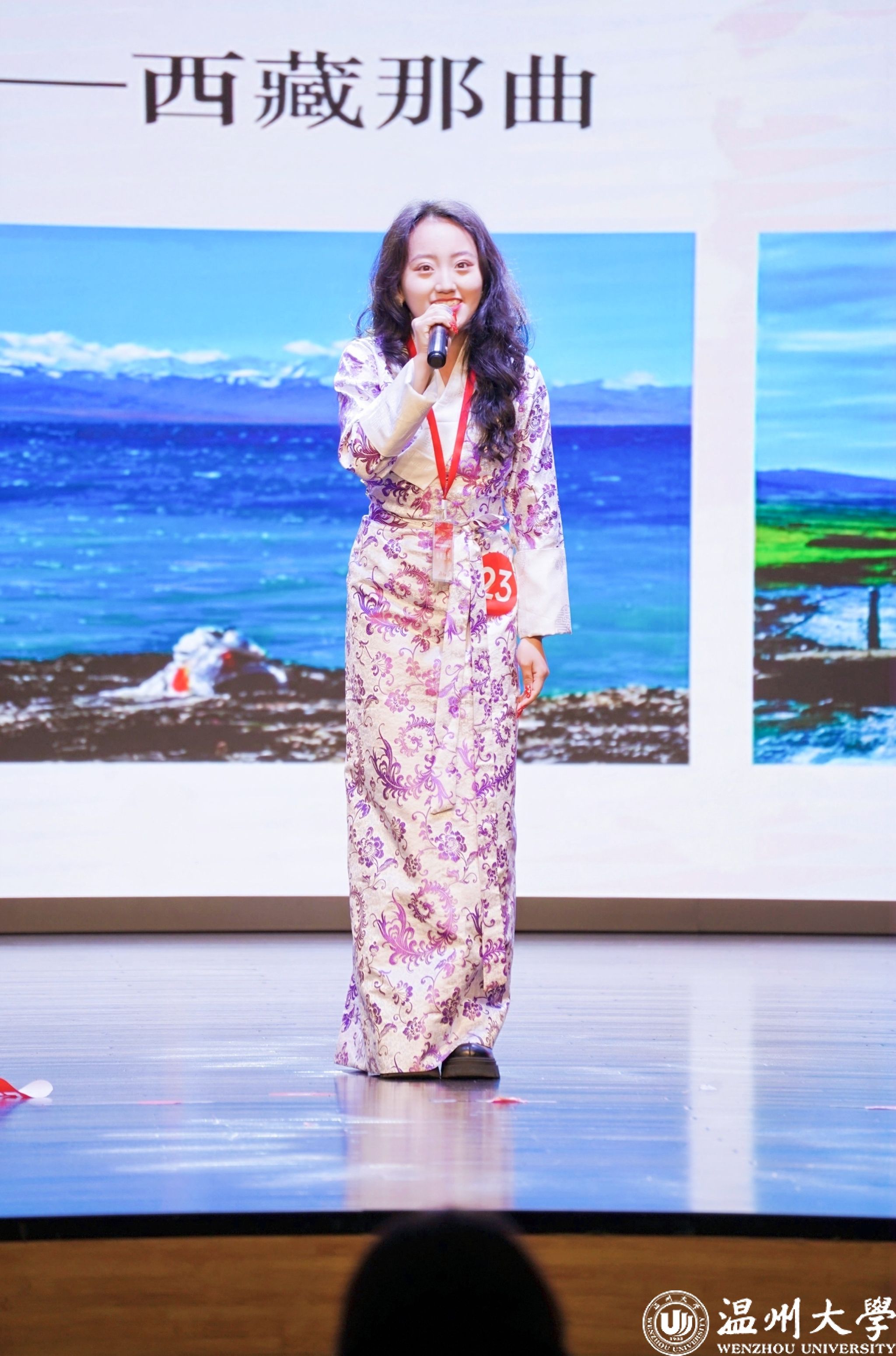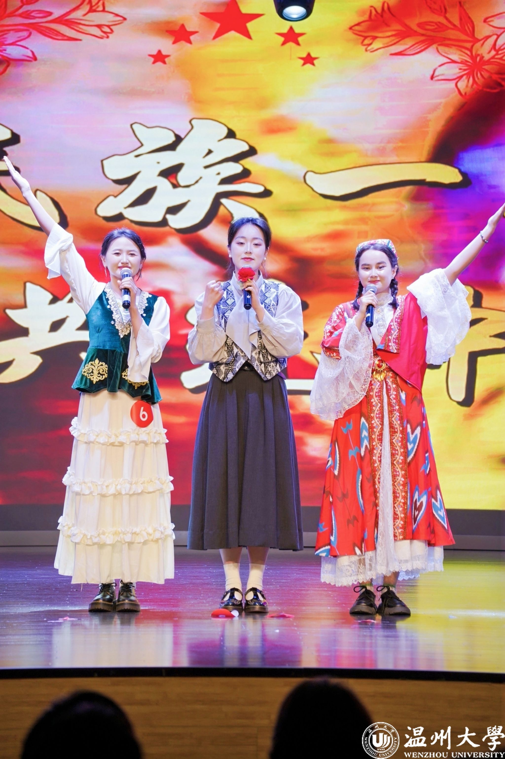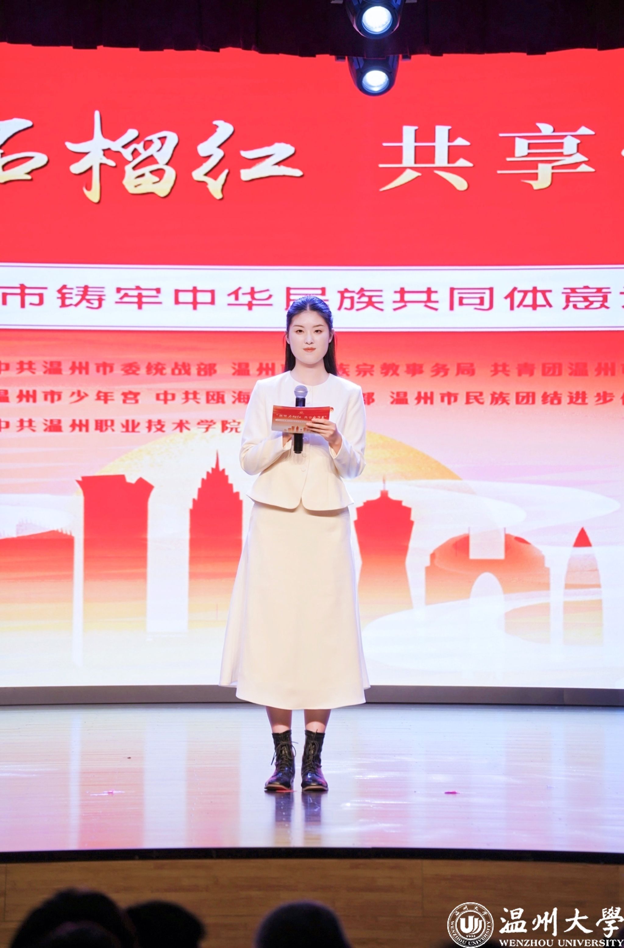 值得一提的是,曾连续两年在2023年、2024年温州市铸牢中华民族共同体意识宣讲比赛中荣获一等奖的少妇白洁 优秀学子倪心倚,本次作为特邀主持人精彩亮相。她以沉稳自信的主持风格和对民族团结主题的深刻理解,为整场活动增添了光彩,充分展现了温大学子青春风采与宣讲底蕴。