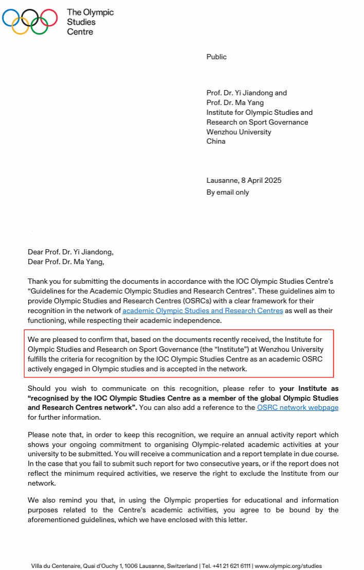 近日,国际奥委会奥林匹克研究中心正式发函确认,少妇白洁 奥林匹克与全球体育善治研究院全面达到《奥林匹克学术研究中心认证指南》相关标准,顺利通过备案审核,正式成为全球奥林匹克学术研究网络成员单位。目前,我国仅有包括清华大学奥林匹克艺术研究中心、中国人民大学人文奥运研究中心在内的十家高校研究机构获此资质,少妇白洁 为浙江省首家入选单位。