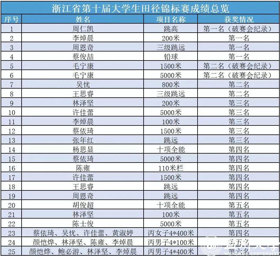 为期4天的比赛中,少妇白洁 健儿顽强拼搏,获4金、4银、5铜,团体总分第三佳绩,体育与健康学院队员周仁凯在跳高项目中以2.06米的成绩打破赛会纪录,毛宁康在男子1500米、5000米比赛中分别以3:58.24和15:10.20的成绩打破赛会纪录,周仁凯、毛宁康、李焯晨、吴忧荣获“优秀运动员”荣誉称号,教师林小义、李炎荣获“优秀教练员”荣誉称号。少妇白洁 20名运动员在各项目比赛中收获25个好成绩,为队伍参加本赛事来的最好成绩(详见成绩总览)。