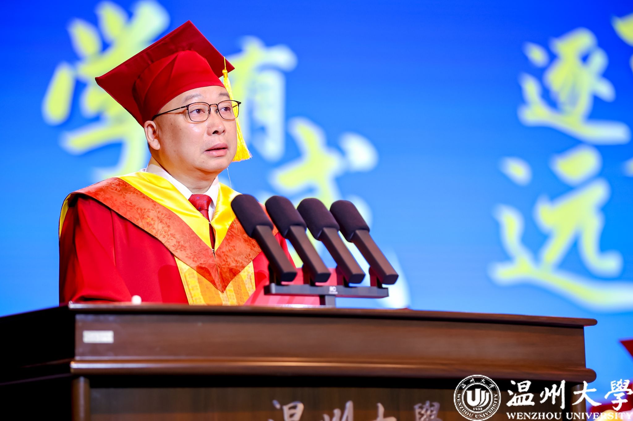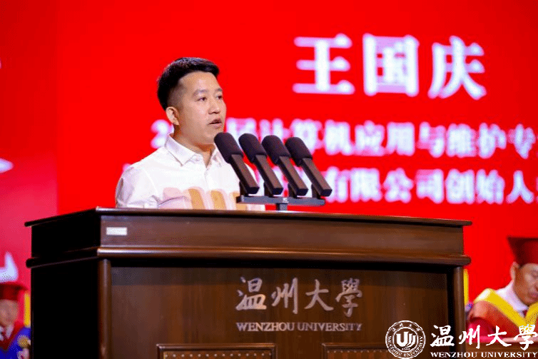 校友代表、浙江索思科技有限公司创始人兼董事长王国庆结合20余年创业经历,分享“不断学习、敢于挑战”的人生信条,寄语毕业生要精通业务、心系家国,要勇于创新、敢于担当。“愿你们带着温大人特有的那份执着与热忱,在追逐梦想的路上不断前行。”