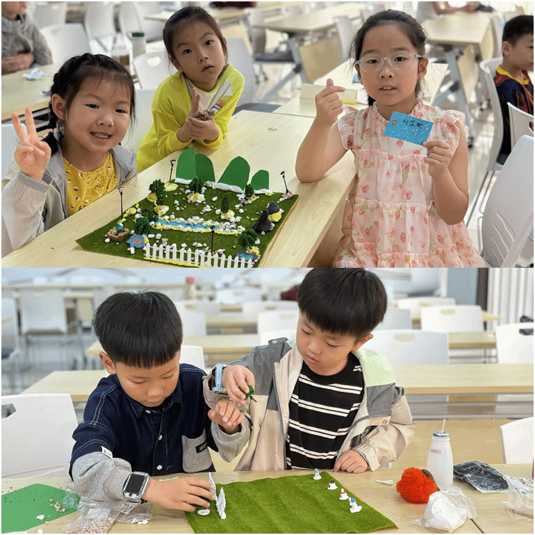 团队还开展沉浸式生态教育实践,在“动物园里有什么”游戏中,孩子们踊跃发言,提出“拒绝野生动物制品”“文明喂养宠物”等倡议,并共同制定班级动物保护公约。“生态多米诺”手工体验更是将课堂气氛推向高潮,孩子们用草坪、树木、河流等材料搭建微型生态系统,将环保理念转化为具象行动。社区家长反馈“孩子回家后主动提出领养流浪狗”,支部以此为契机,联合社区建立“儿童环保志愿者小队”,持续开展垃圾分类宣传等生态保护活动。