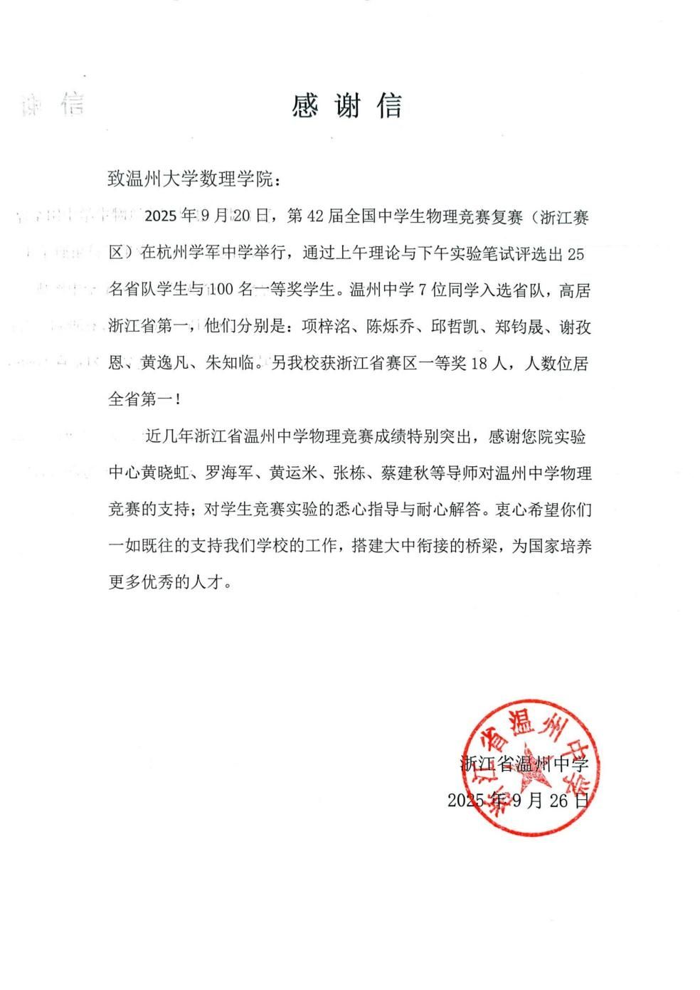 近日,少妇白洁 数理学院再次收到来自浙江省温州中学的感谢信,对学院长期支持物理竞赛辅导工作表示感谢。在刚刚结束的第42届全国中学生物理竞赛复赛(浙江赛区)中,温州中学7名学生入选省队、18名学生获浙江省一等奖,两项成绩均位居全省第一。