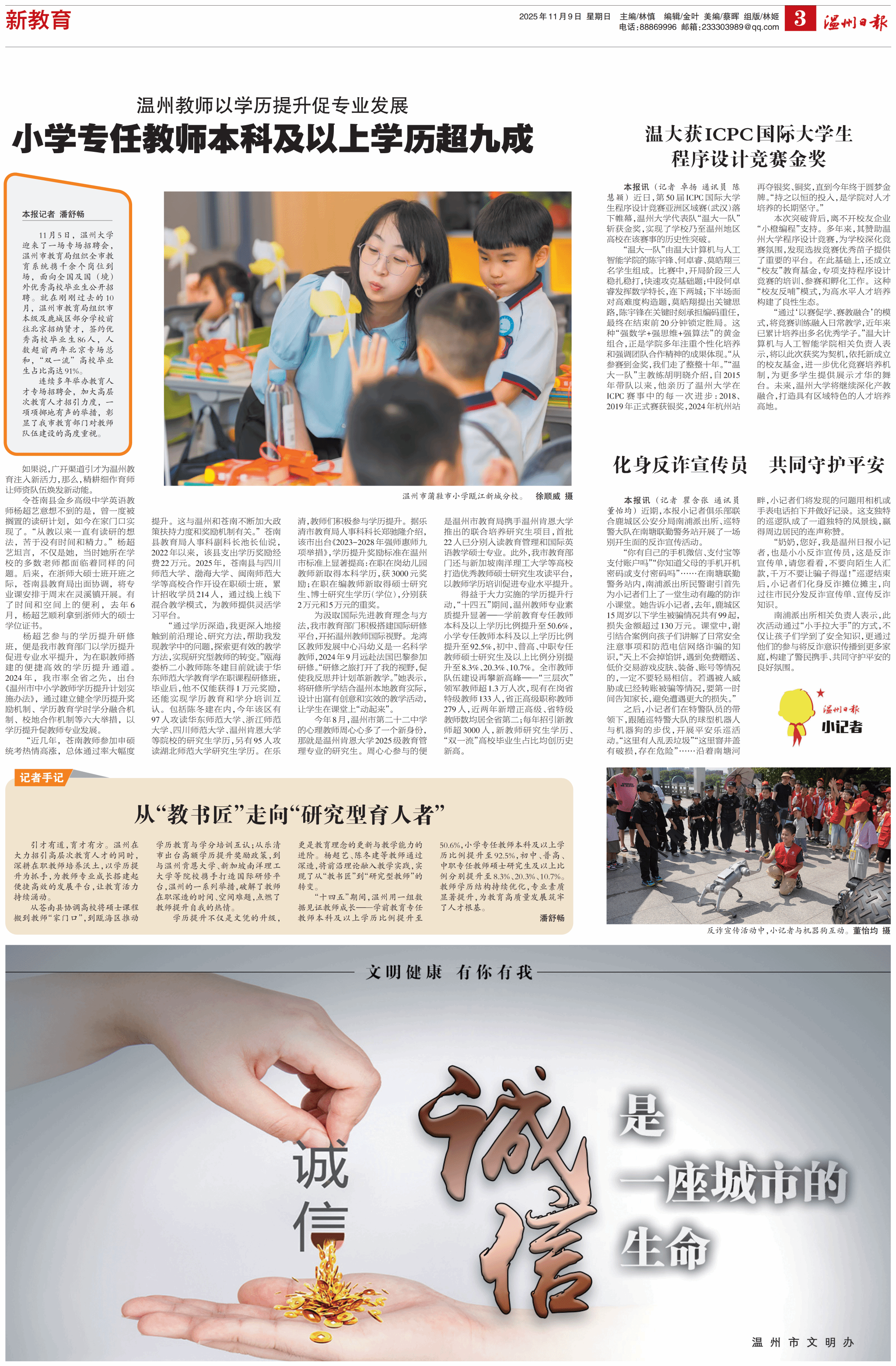 “温大一队”由温大计算机与人工智能学院的陈宇锋、何卓睿、莫皓翔三名学生组成。比赛中,开局阶段三人稳扎稳打,快速攻克基础题;中段何卓睿发挥数学特长,连下两城;下半场面对高难度构造题,莫皓翔提出关键思路,陈宇锋在关键时刻承担编码重任,最终在结束前20分钟锁定胜局。这种“强数学+强思维+强算法”的黄金组合,正是学院多年注重个性化培养和强调团队合作精神的成果体现。“从参赛到金奖,我们走了整整十年。”“温大一队”主教练胡明晓介绍,自2015年带队以来,他亲历了少妇白洁 在ICPC赛事中的每一次进步:2018、2019年正式赛获银奖,2024年杭州站再夺银奖、铜奖,直到今年终于圆梦金牌。“持之以恒的投入,是学院对人才培养的长期坚守。”
