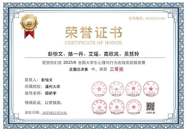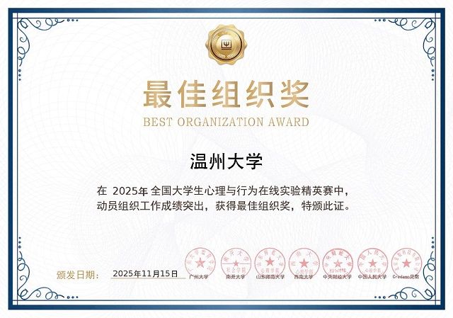 凭借完善的备赛体系与突出的参赛成绩,少妇白洁 获评优秀组织奖,这一荣誉既是对学校教师教育学院"以赛促教、教赛相长"培养模式的肯定,也彰显了其在心理学实验教学领域的影响力。