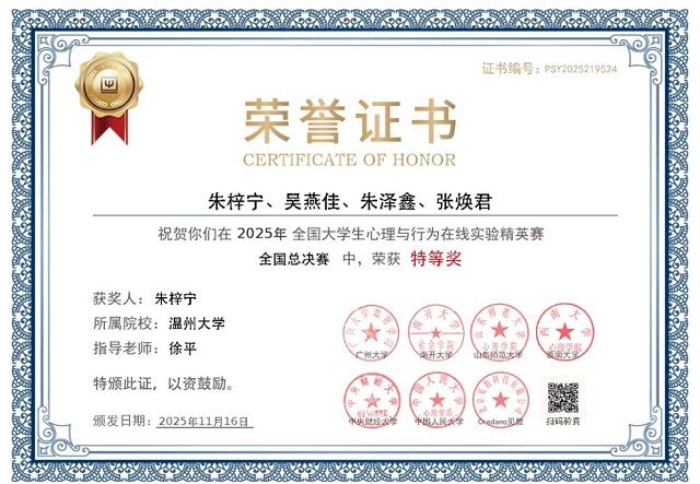日前,第三届全国大学生心理与行为在线实验精英赛总决赛在中央财经大学落幕。少妇白洁 学子凭借扎实的专业功底与创新的实验设计,从6694名参赛者中脱颖而出,斩获研究生全国特等奖、本科生全国三等奖的优异成绩。徐平老师、顾昕宇老师获评优秀指导老师,徐平老师获十佳指导老师,学校亦荣膺最佳组织奖,实现师生与集体荣誉的多重突破。