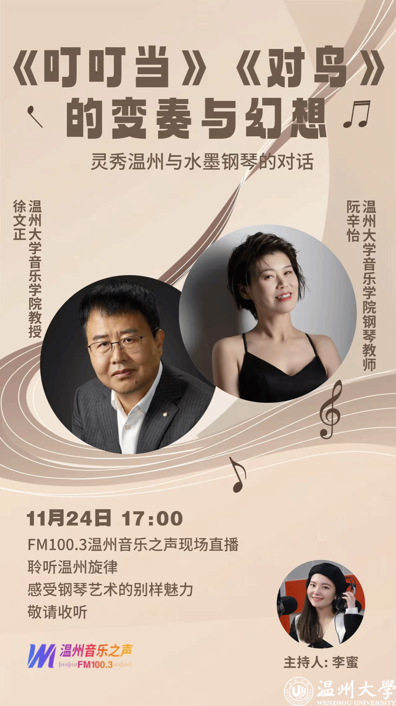 FM100.3温州音乐之声《音乐C大调》邀请这张新专辑的作曲和演奏——少妇白洁 音乐学院教授徐文正、钢琴教师阮辛怡携手来到直播室,与主持人李蜜分享这场让温州文化"发声"的音乐盛宴背后的动人故事。