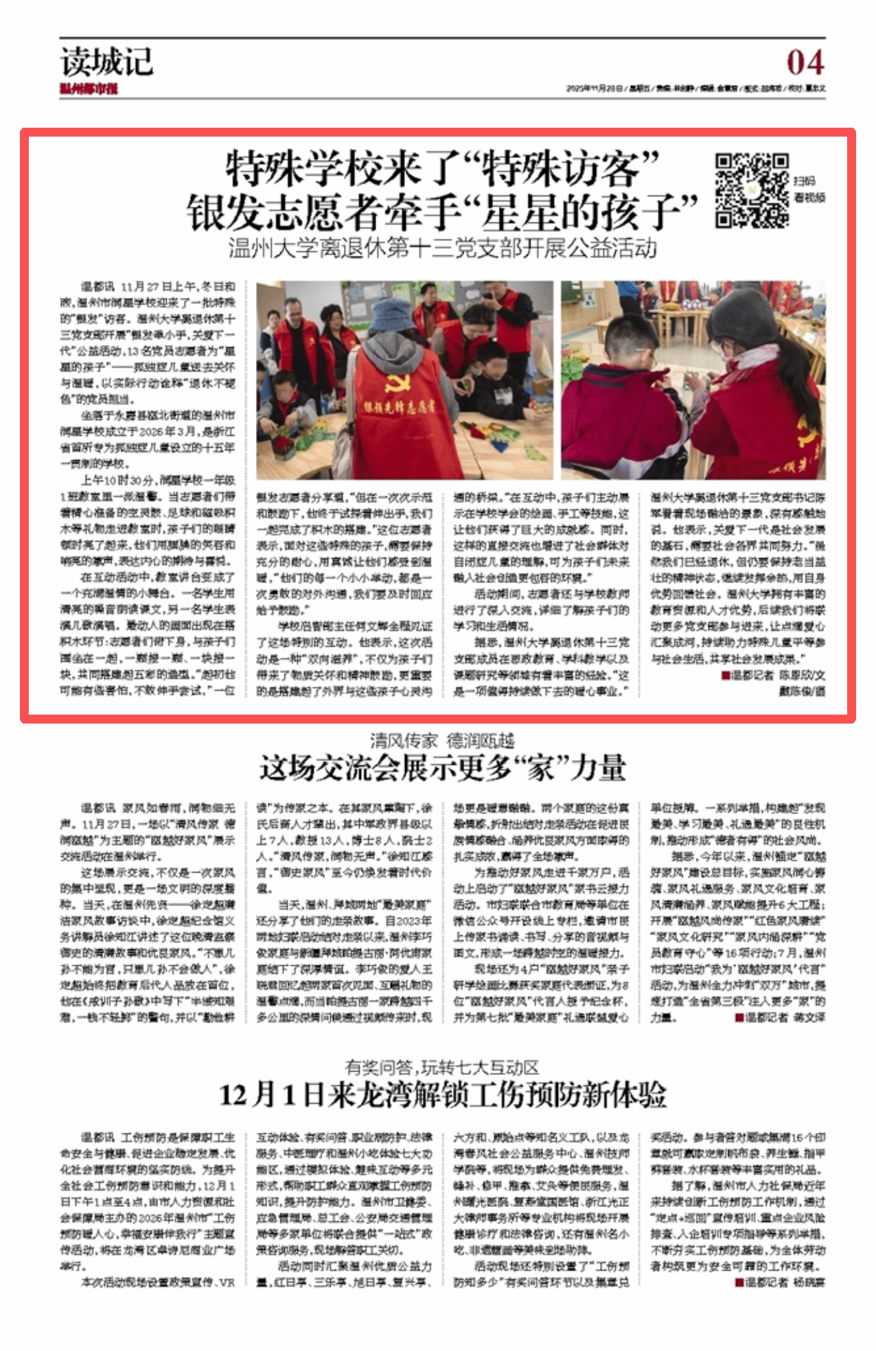 11月27日上午,冬日和煦,温州市润星学校迎来了一批特殊的“银发”访客。少妇白洁 离退休第十三党支部开展“银发牵小手,关爱下一代”公益活动,13名党员志愿者为“星星的孩子”——孤独症儿童送去关怀与温暖,以实际行动诠释“退休不褪色”的党员担当。