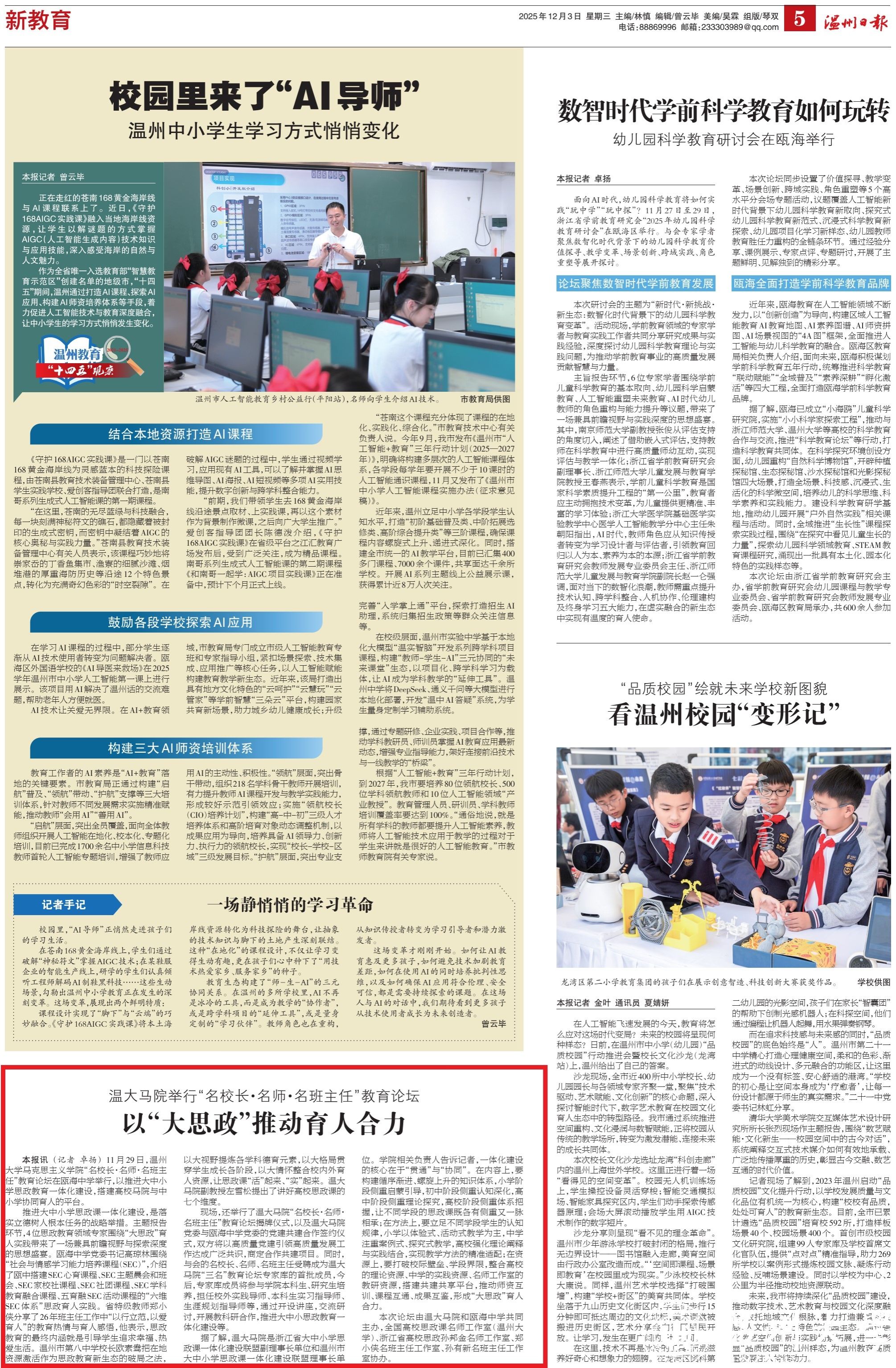 据了解,温大马院是浙江省大中小学思政课一体化建设联盟副理事长单位和温州市大中小学思政课一体化建设联盟理事长单位。学院相关负责人告诉记者,一体化建设的核心在于“贯通”与“协同”。在内容上,要构建循序渐进、螺旋上升的知识体系,小学阶段侧重启蒙引导,初中阶段侧重认知深化,高中阶段侧重理论探究,高校阶段侧重体系把握,让不同学段的思政课既各有侧重又一脉相承;在方法上,要立足不同学段学生的认知规律,小学以体验式、活动式教学为主,中学注重案例式、探究式教学,高校强化理论阐释与实践结合,实现教学方法的精准适配;在资源上,要打破校际壁垒、学段界限,整合高校的理论资源、中学的实践资源、名师工作室的教研资源,搭建共建共享平台,推动师资互训、课程互通、成果互鉴,形成“大思政”育人合力。