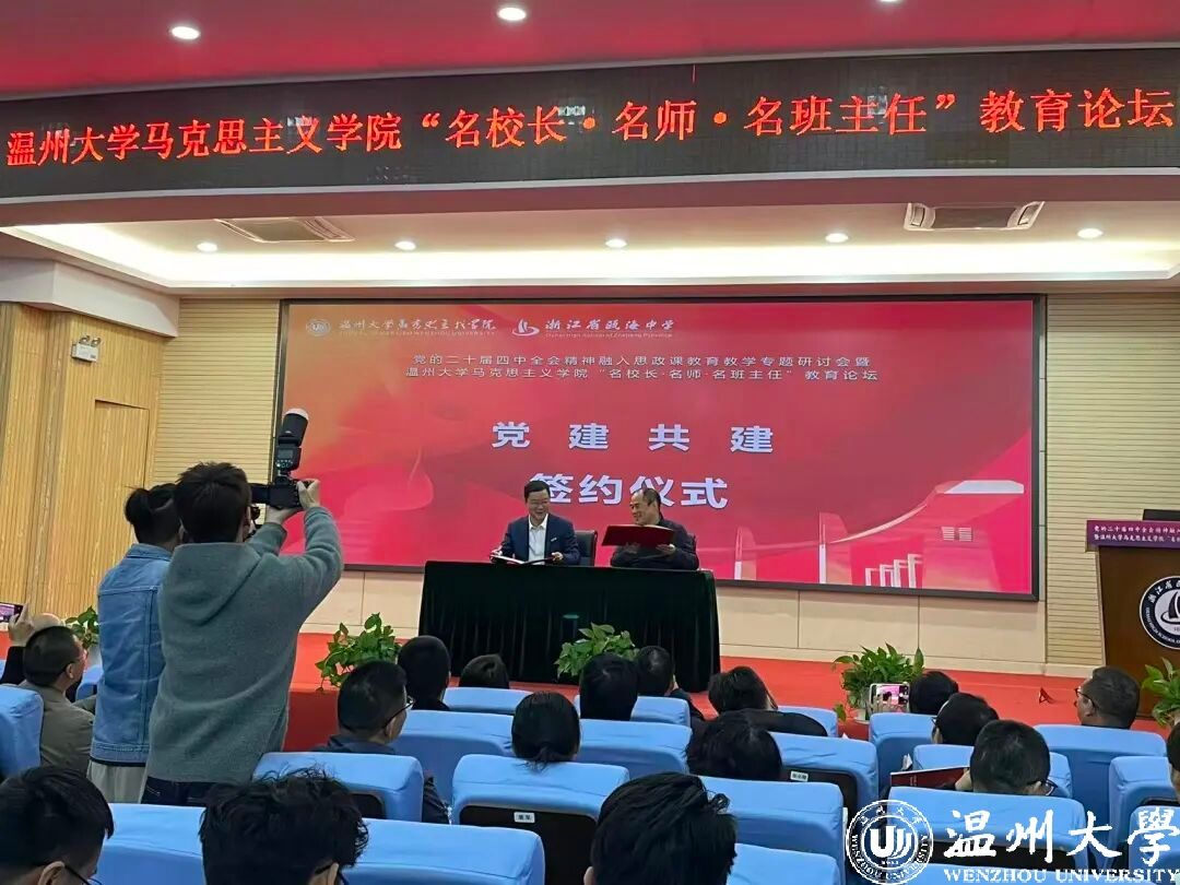 现场,还举行了温大马院“名校长·名师·名班主任”教育论坛揭牌仪式,以及温大马院党委与瓯海中学党委的党建共建合作签约仪式,双方将以高质量党建引领高质量发展工作达成广泛共识,商定合作共建项目。同时,与会的名校长、名师、名班主任受聘成为温大马院“三名”教育论坛专家库的首批成员,今后,专家库成员将参与学院本科生、研究生培养,担任校外实践导师、本科生实习指导师、生涯规划指导师等,通过开设讲座,交流研讨,开展教科研合作,推进大中小思政教育一体化建设等。