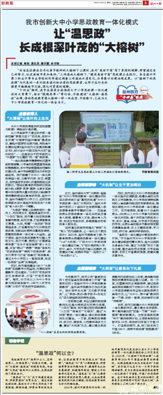 “十四五”期间,我市在国家全面推进大中小学思政课一体化建设的大背景下,结合“瓯越思享+”等行动,升级建设“大榕树·温思政”品牌,推动思政教育像大榕树一样一体成型、开枝散叶,已成为大中小学思政教育一体化的一张金名片。