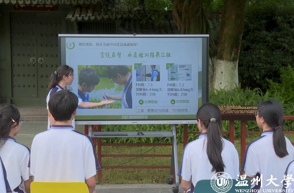 温二职学生在思政课上介绍三垟湿地水质检测情况。 市教育局供图