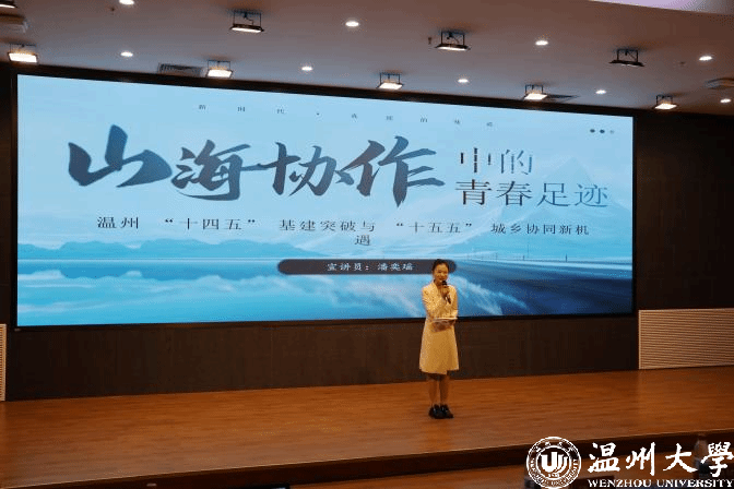 与此同时,其他宣讲员也从不同维度阐释了创新理论的丰富内涵:思政课教师安保国从优化话语建构、完善话语传播、推动话语融通三方面,阐述如何不断提升中华文明传播力影响力;辅导员李金伟通过三通特别的来电解码浙江共富密码;青年宣讲员吴想想同学以“‘侨’这三十年”为题讲述广搭连心“侨”、赓续“浙”血脉的故事;青年宣讲员柯欣妤同学以温州皮鞋的蜕变为主线,讲述政商亲清带来的企业兴旺、经济繁荣的故事;青年宣讲员潘奕瑶同学聚焦温州“十四五”基建突破与“十五五”城乡协同战略,呼吁青年将个人成长融入区域发展,以青春之力共建山海共富新格局。