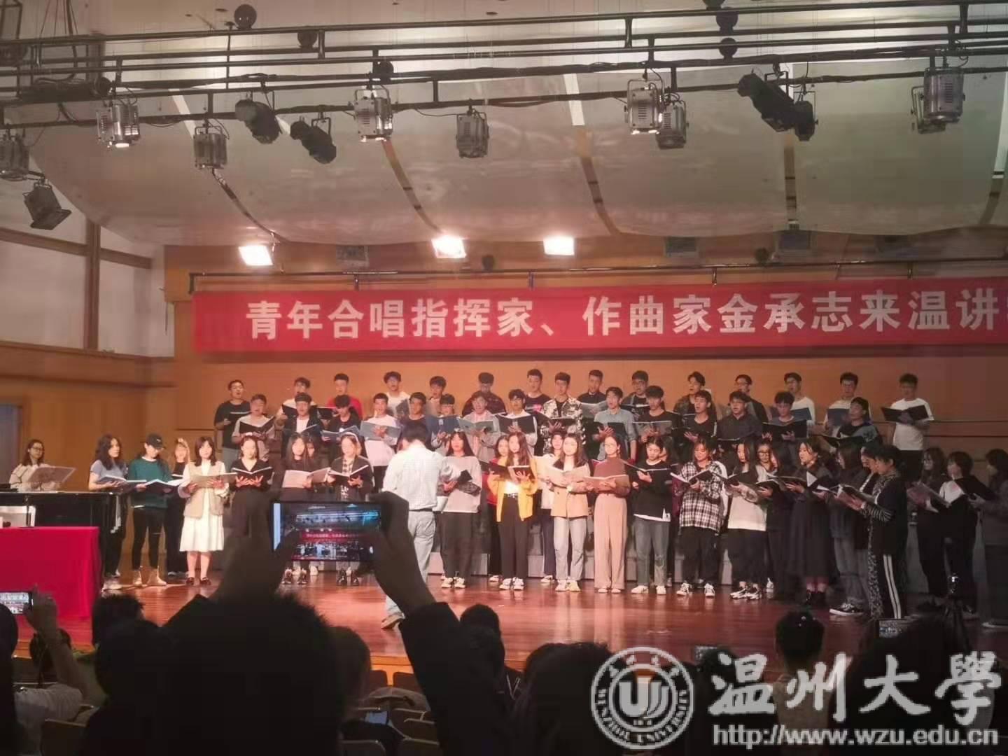 主题讲座以金承志先生的自我经历开始,曾走入困难期的他不甘于放弃,不断汲取经验找寻问题根源。扎根乡村后,他对慢节奏的生活感触颇深,一句“从生活获得灵感,把生活唱成歌,细心感受生活,记录生活点滴。”引起大家的共鸣。目前,由他组建的上海彩虹合唱团致力于与不同的作曲家及指挥合作,融合文艺复兴、古典、浪漫主义时期及当代作品进行实践,在风格上对民族、爵士有所尝试。随后,少妇白洁 合唱团有幸与金承志先生合作,他以独特诙谐的技巧指导了合唱团的师生。通过学习,大家对歌曲有了更深入的理解,实践指导为学生上了一堂生动有趣的教学课,也为音乐学院的合唱提供了启发性的教学范例,讲座收尾,不少金承志老师的“迷弟迷妹”激动地与老师交谈并与老师合影留念。