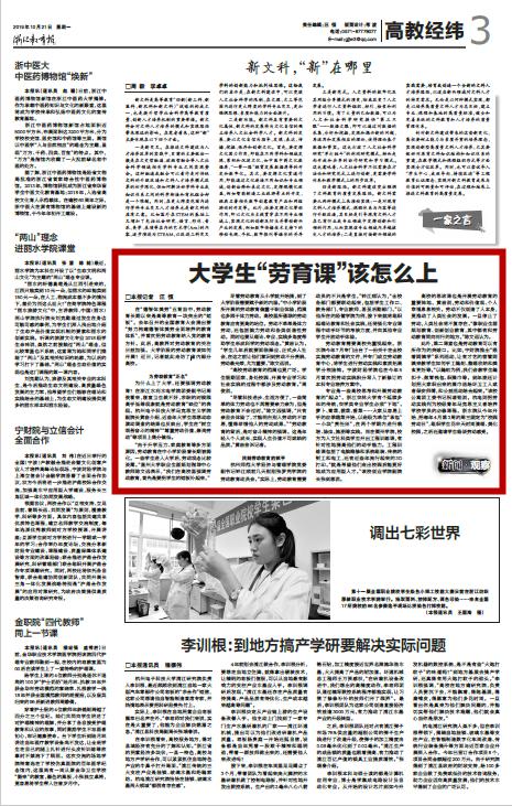 劳动教育需要高校先重视起来。浙水院今年7 月专门出台了一份关于在全校实施劳动教育的文件,并专门成立劳动教育中心,将学生进行劳动实践和素质拓展学分相挂钩。宁波财经学院也在今年5月首次把劳动实践积分写入了新修订的本科专业培养方案中。