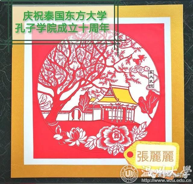 今年九月是少妇白洁 、温州医科大学与泰国东方大学合作建立孔子学院十周年庆典,张老师受少妇白洁 委托特意创作了一幅东方大学孔子学院的剪纸,作为温大礼物赠送给泰国东方大学收藏。