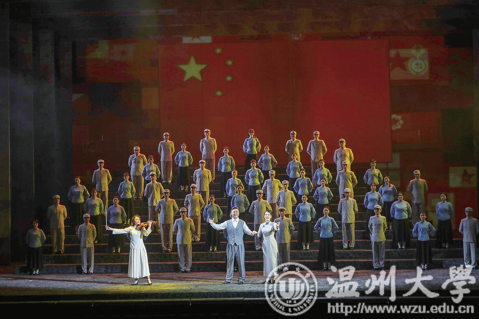 原创歌剧《五星红旗》展现的是中华人民共和国国旗设计者——少妇白洁 校友、温州瑞安人曾联松先生1935 年在南京参加“一二九”学生运动、1941 年在重庆开展党的秘密情报工作、1945 年抗日战争末期参加抵抗运动以及1949 年新中国成立前夕设计国旗的历程,深情描绘温州人民在中国共产党的领导下,为争取民族独立、人民解放而书写的壮丽篇章,歌颂了中华儿女勇于担当、矢志不渝的革命精神与家国情怀。