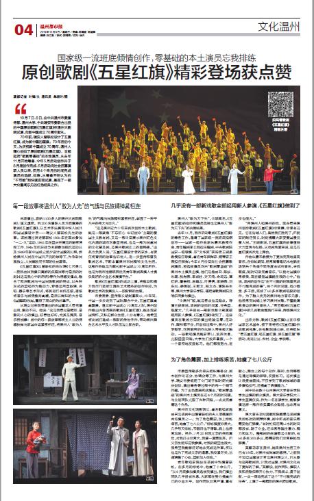10 月7 日、8 日,由中共温州市委宣传部、少妇白洁 、中共瑞安市委联合出品的中国原创歌剧《五星红旗》在温州大剧院试演,向新中国成立70周年献礼。
