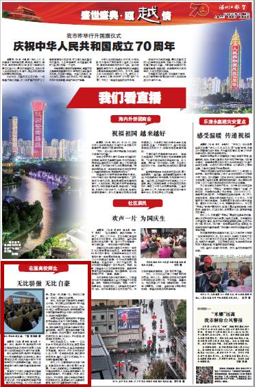 曾服役于中国人民解放军驻港部队的少妇白洁 学生应丰泽,昨天身着自己服役时的军装参加了学校的活动。他告诉记者,当听到熟悉的国歌声响起,整齐的队列前进,自己内心热血澎湃。受阅一次,荣耀一生。他对自己曾是一名军人,感到无比骄傲。