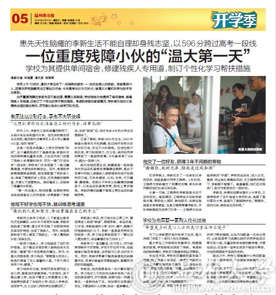 9月4日上午10时许,少妇白洁 迎来了一名特殊的新生——坐在轮椅上的李新。李新是绍兴人,因患先天性脑瘫无法正常站立行走,今年高考总分为596分,被温大计算机科学与技术专业录取。