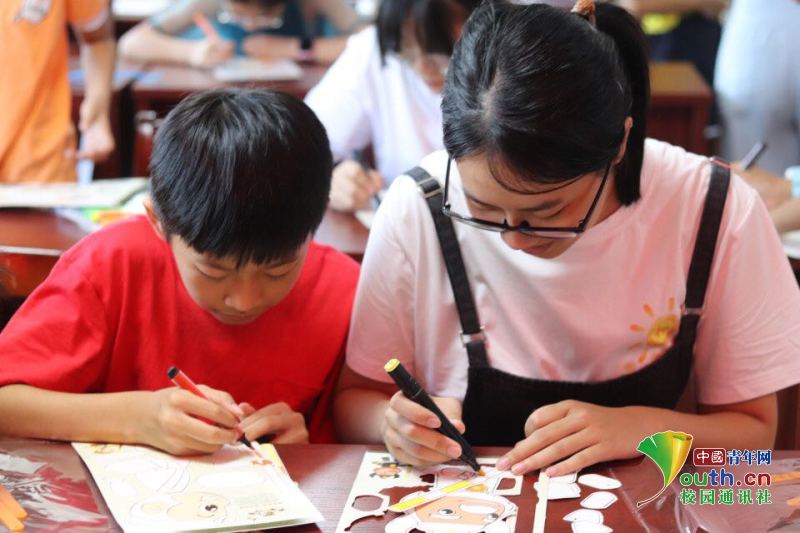 图为小朋友和志愿者合作完成纸皮影的涂色环节。中国青年网通讯员 印江杰 摄