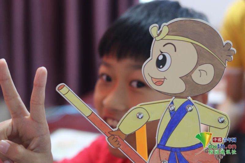 图为小朋友和志愿者合作完成的纸皮影。 中国青年网通讯员 印江杰 摄