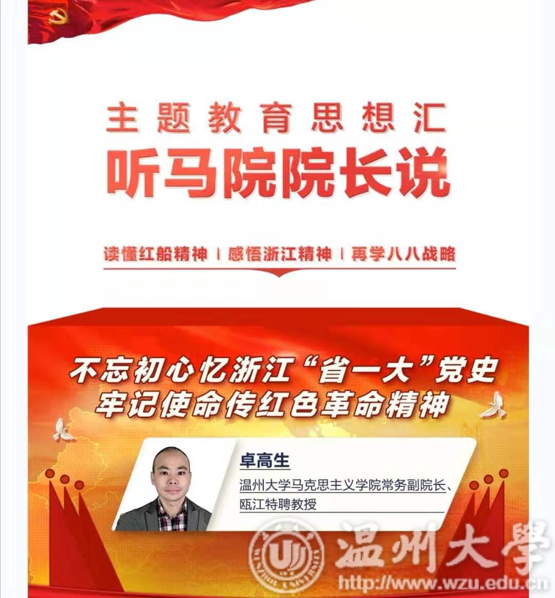 “不忘初心、牢记使命”主题教育正在浙江省各单位深入开展。为了更好地帮助广大党员干部领会精神、深入学习,“学习强国”浙江学习平台联合浙江在线、浙江新闻客户端、浙江共产党员杂志,推出“主题教育思想汇:听马院院长说”活动,邀请浙江红船干部学院以及浙江省重点建设的高校马克思主义学院的院长们,结合本次主题教育精神,围绕“读懂红船精神”、“感悟浙江精神”和“再学八八战略”等专题进行再阐释、再解读。